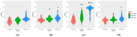 The MSD assay provides a readout in units of mean luminescence intensity, and all readouts were directly log-transformed prior to analysis. Univariate analysis comparisons between groups were made using a Shapiro–Wilk Normality Test followed by a Student’s T-test or a Wilcoxon signed rank test. We applied a multiple test correction using the Benjamini–Hochberg method; p-values were considered significant if their adjusted p-value was <0.01. All statistical analysis was carried out in R using the stats, ggplot2, and corrplot packages.