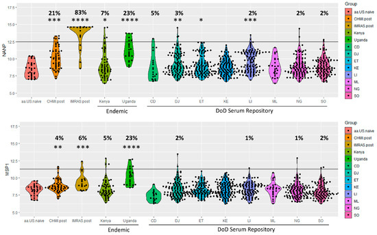 Seropositivity for CSP(NANP) and MSP-1 antigens in samples from endemic countries and the DoD Serum Repository (SR). Antibody responses are shown for U.S. malaria-naïve samples, CHMI and IMRAS samples, samples from malaria endemic populations in Kenya and Uganda, and DoD SR samples. Seropositivity % is reported as well as the statistical significance of any group-level differences in responses with that of U.S. naïve samples. Country abbreviations: CD = Chad, DJ = Djibouti, ET = Ethiopia, KE = Kenya, LI = Liberia, ML = Mali, NG = Niger, SO = Somalia. Statistical significance: p < 0.05 (*), p < 0.01 (**), p < 0.001 (***), and p < 1 × 10−4 (****).