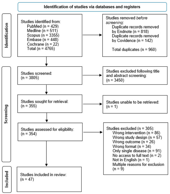 A total of 4765 records were identified, of which 956 were automatically detected as duplicates through the Covidence application (Melbourne, Australia) [10]. Following title and abstract screening, 354 remained for full text screening. Finally, 47 studies fulfilled the inclusion criteria (Figure 1) [13,14,15,16,17,18,19,20,21,22,23,24,25,26,27,28,29,30,31,32,33,34,35,36,37,38,39,40,41,42,43,44,45,46,47,48,49,50,51,52,53,54,55,56,57,58,59].