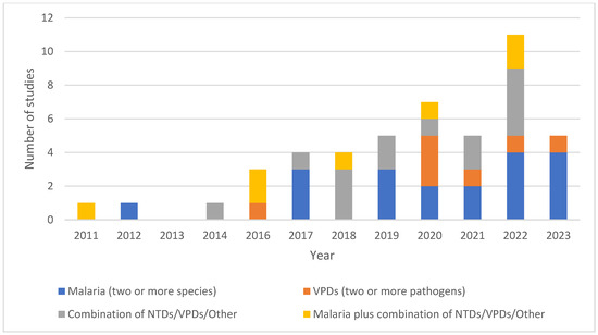 Studies were identified from 30 countries. When classified into regions, twenty studies (66%) were conducted in the African region, twelve in the Americas region (25%), eight in the Western Pacific region (17%), four in the European region (8%), and three in the South-East Asian region (6%). Haiti (n = 8) was the most studied country, followed by Ethiopia (n = 6), Bangladesh (n = 3), Kenya (n = 3), and Tanzania (n = 3). The median time between the collection of samples and publication of studies was four years (range: 1–14 years). The earliest study was published in 2011, with peak number of studies (n = 13) published in 2022, decreasing to only 5 studies in 2023 (Figure 2). This shows an increasing trend in publications. Most studies (n = 19) focused on malaria (two or more species), followed by NTDs/VPDs/Other (n = 14), and malaria plus the combination of NTDs/VPDs/Other (n = 7). Seven studies focused on VPDs (two or more pathogens).