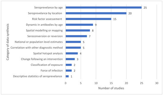 Several methods of data synthesis were performed, including age-specific seroprevalence (n = 17) or risk factor analysis (n = 10). Seven studies estimated seroprevalence by geographic region, two studies provided maps of seroprevalence, and nine studies used spatial analysis methods, of which one was for the identification of hotspots. Four studies were used to assess the impact of an intervention. Five studies described the correlation of antibody seropositivity with another diagnostic method (polymerase chain reaction (PCR), parasitaemia, and vaccine history). Figure 3 summarises the data synthesis methods used, and further information can be found in Supplementary Material S5.