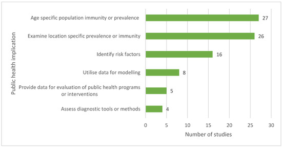 Potential or reported public health implications of the included studies. Some studies belong to more than one category; thus, the total exceeds the number of included studies.