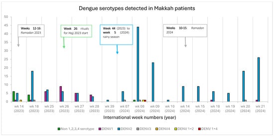 Melebari, S.; Hafiz, A.; Natto, H.A.; Elamin, M.O.; Jalal, N.A.; Hakim, A.; Rushan, S.; Fallatah, O.; Alzabeedi, K.; Malibari, F.; et al. Estimation and Characterization of Dengue Serotypes in Patients Presenting with Dengue Fever at Makkah Hospitals. Trop. Med. Infect. Dis. 2025, 10, 27. https://doi.org/10.3390/tropicalmed10010027