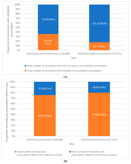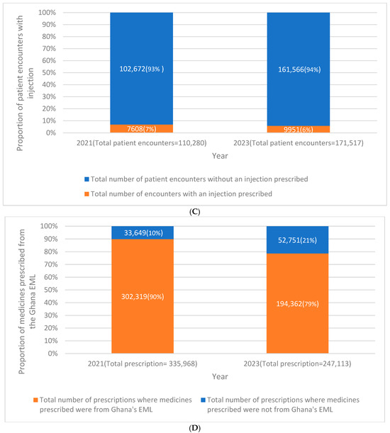 (A) Comparison of the number and proportion of patient encounters that resulted in an antibiotic prescription in the outpatient department of the University Hospital, KNUST, in Ghana between January and December 2021 compared with January– to December 2023. Percent change (2023 vs. 2021) = 18.1% (95% confidence interval: 17.7–18.4%, p-value: <0.001). (B) Comparison of the number and proportion of medicines prescribed in INN (International Non-proprietary Names) format (generic names) in the outpatient department of the University Hospital, KNUST, in Ghana between January and December 2021 compared with January to December 2023. Percent change (2023 vs. 2021): −4.4% (95% confidence interval: −4.2 to −4.6%, p-value: <0.001). (C) Change in number and proportion of patient encounters with an injection prescription in the outpatient department of the University Hospital, KNUST, in Ghana between January and December 2021 compared with January to December 2023. Percent change (2023 vs. 2021) = 1.1% (95% confidence interval: 0.9–1.3%, p-value: <0.001). (D) Change in number and proportion of medicines prescribed from Ghana’s essential medicines list (EML), 2017 in the outpatient department of the University Hospital, KNUST, in Ghana between January and December 2021 compared with January to December 2023. Percent change (2023 vs. 2021) = 11.3% (95% confidence interval: 11.1–11.5%, p-value: <0.001). Figure 1A–D Change in WHO prescribing indicators in the outpatient department of the University Hospital, KNUST, in Ghana between January and December 2021 compared with January to December 2023.