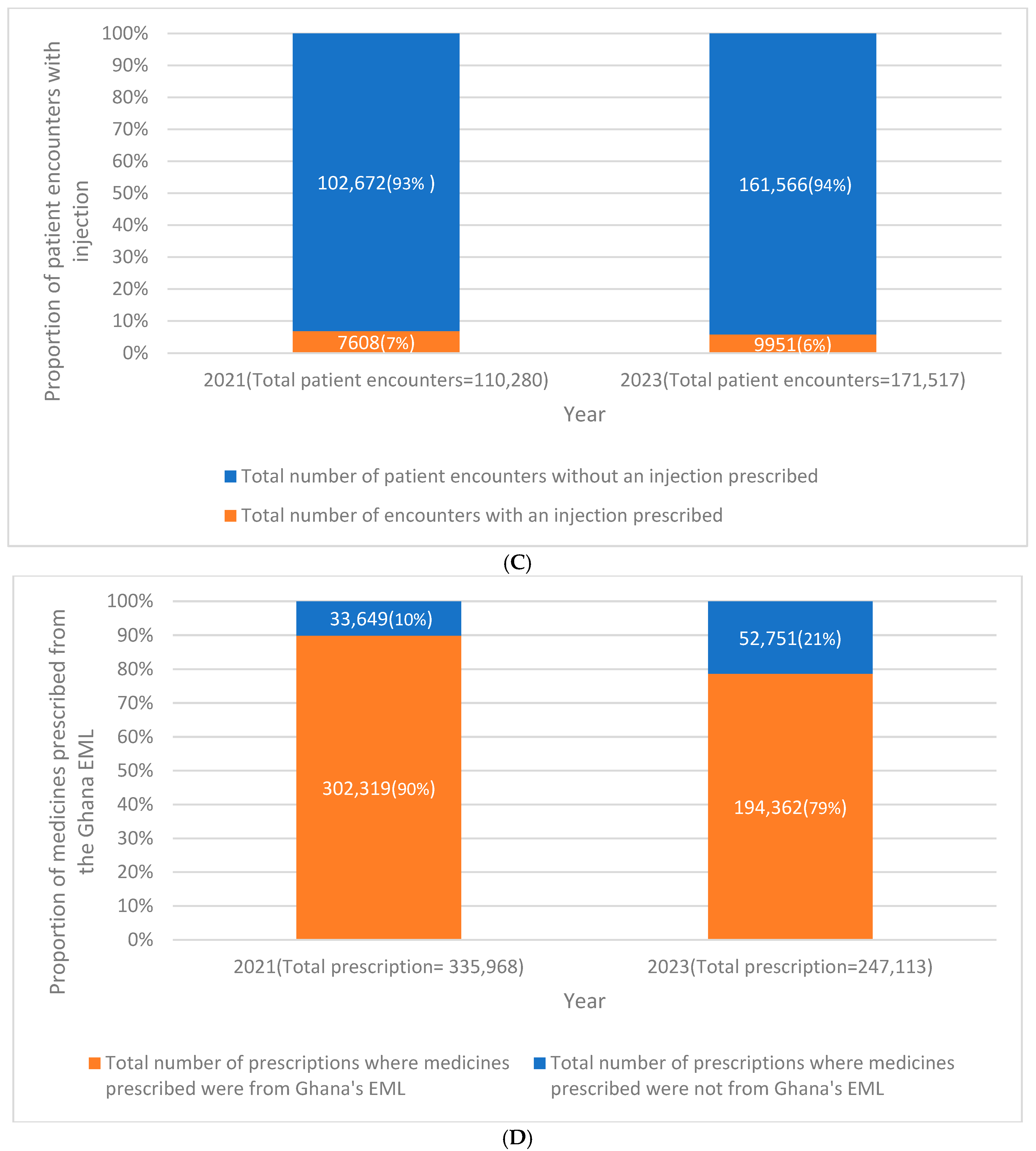 Percentage of medicines prescribed from an essential medicines list | Total number of medicines prescribed from the EML | Total number of medicines prescribed | 100% |