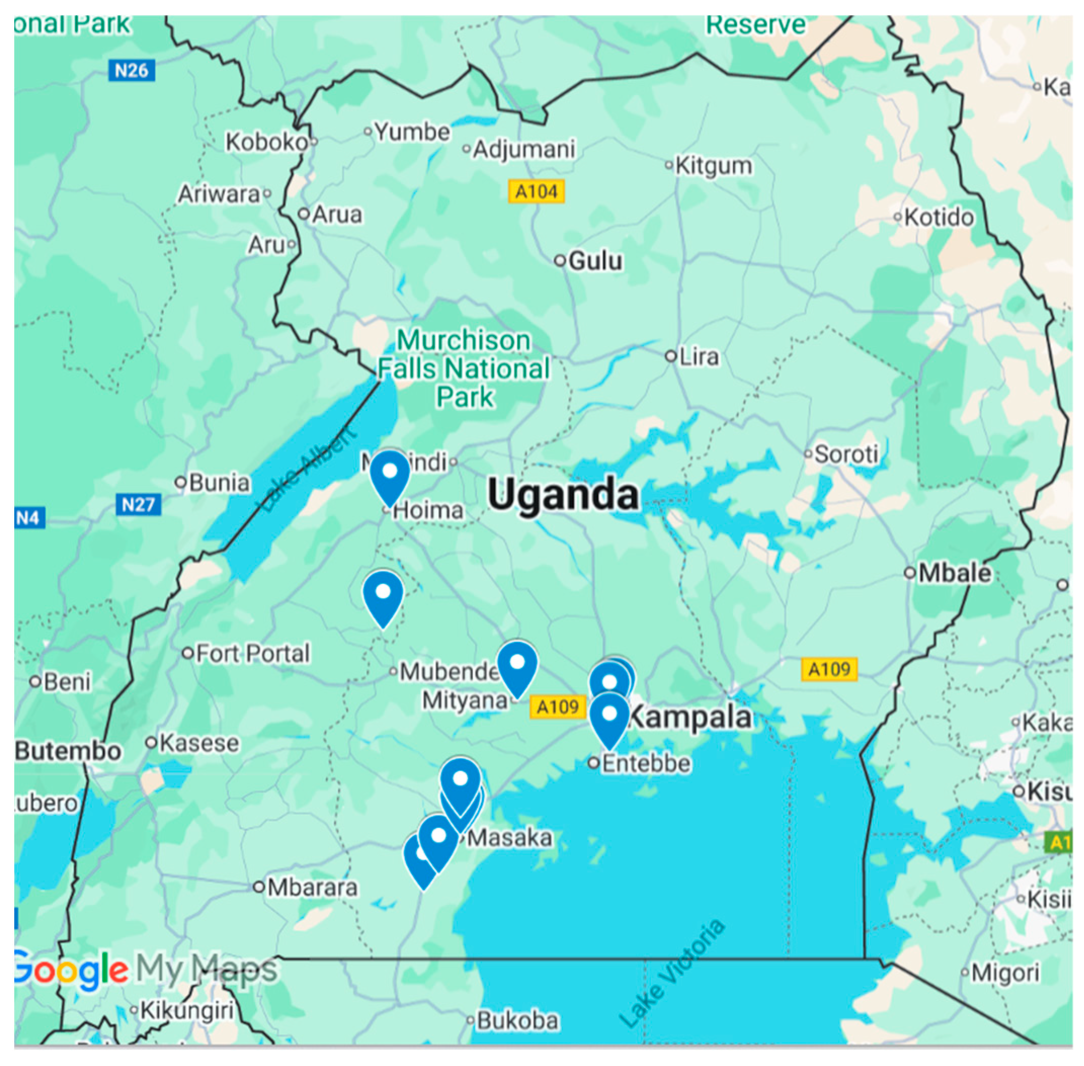 - Ministry of Health, The Repubic of Uganda. Consolidated Guidelines for the Prevention and Treatment of HIV and AIDS in Uganda; Ministry of Health, The Repubic of Uganda: Kampala, Uganda, 2022. [Google Scholar]