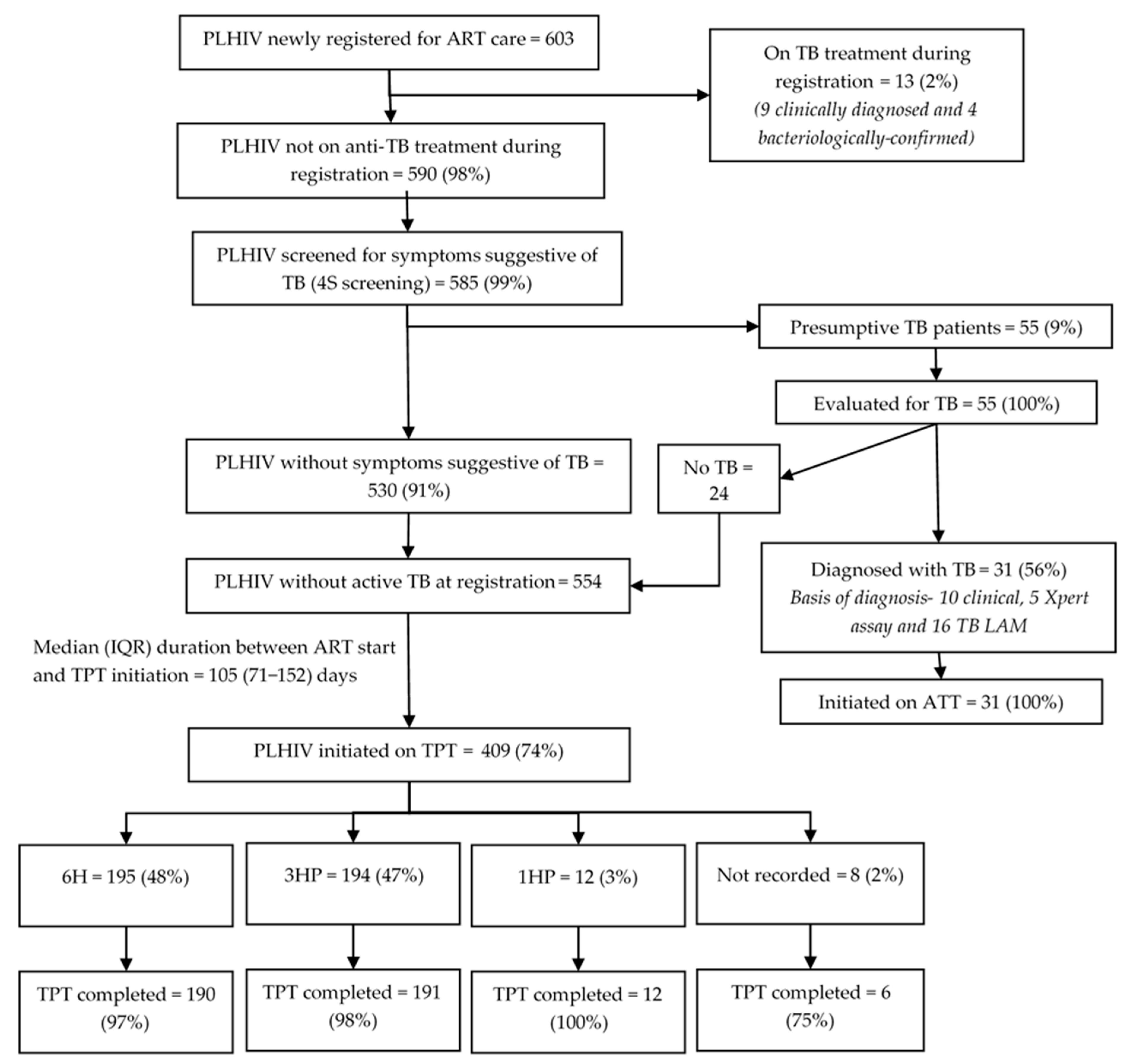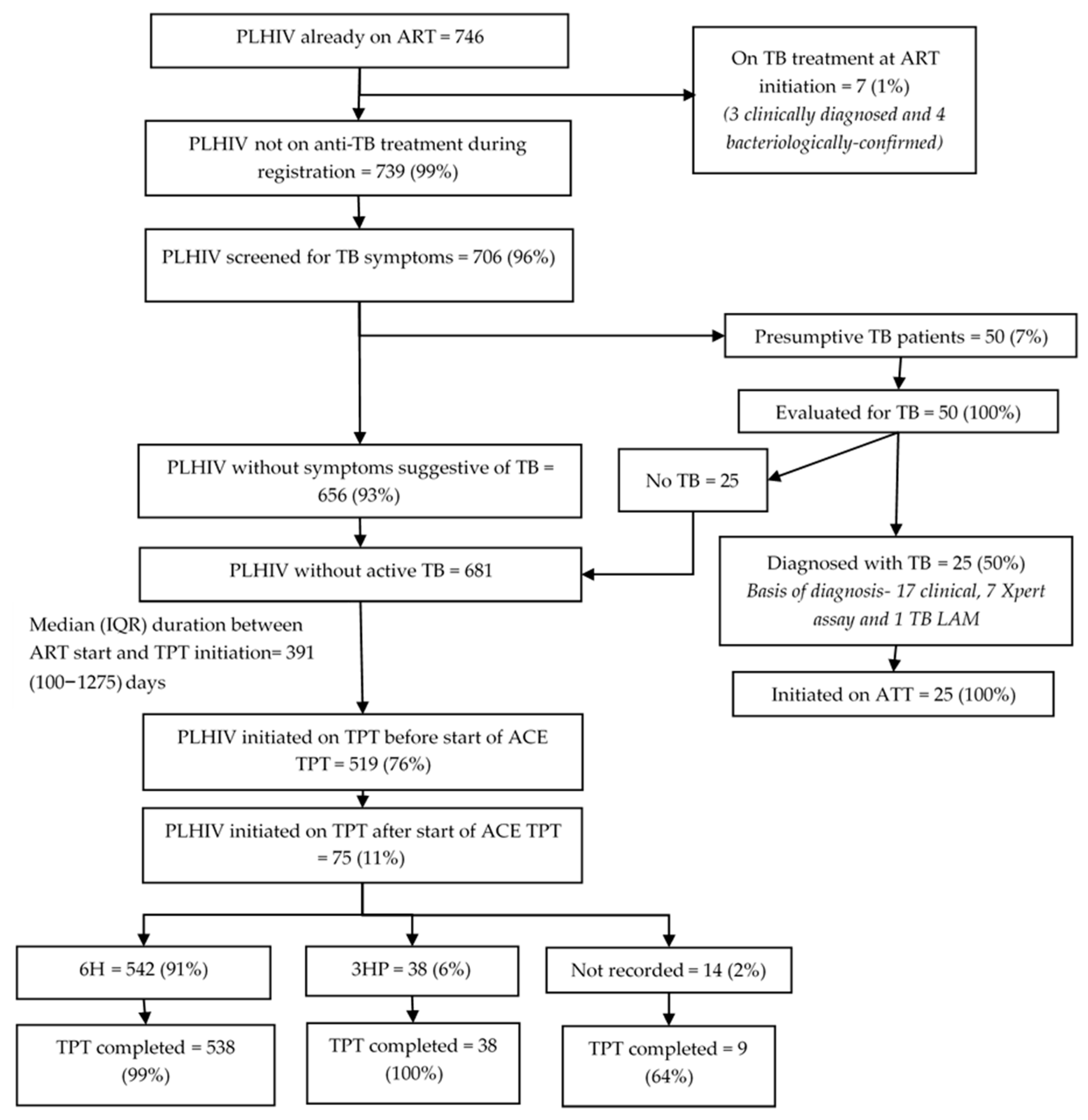 - Gunde, L.; Wang, A.; Payne, D.; O’Connor, S.; Kabaghe, A.; Kalata, N.; Maida, A.; Kayira, D.; Buie, V.; Tauzi, L.; et al. Characteristics of TPT Initiation and Completion among People Living with HIV. IJTLD Open 2024, 1, 11. [Google Scholar] [CrossRef]