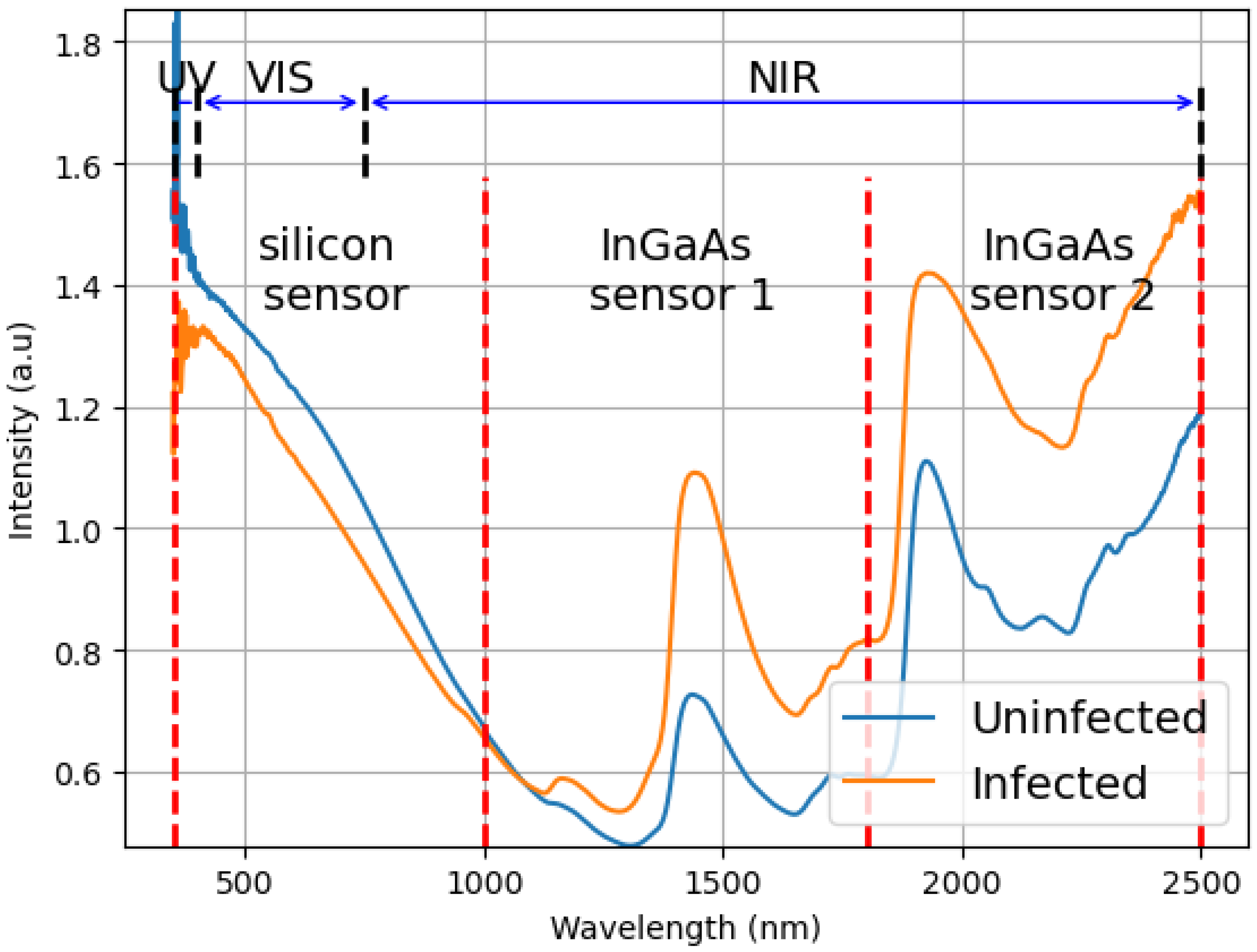 - The absorbance measurements at various wavelengths, ranging from 350 to 2500 nm;