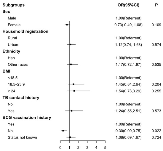 - Huang, W.; Fang, Z.; Luo, S.; Lin, S.; Xu, L.; Yan, B.; Yang, Y.; Liu, X.; Xia, L.; Fan, X.; et al. The effect of BCG vaccination and risk factors for latent tuberculosis infection among college freshmen in China. Int. J. Infect. Dis. 2022, 122, 321–326.2. [Google Scholar] [CrossRef] [PubMed]