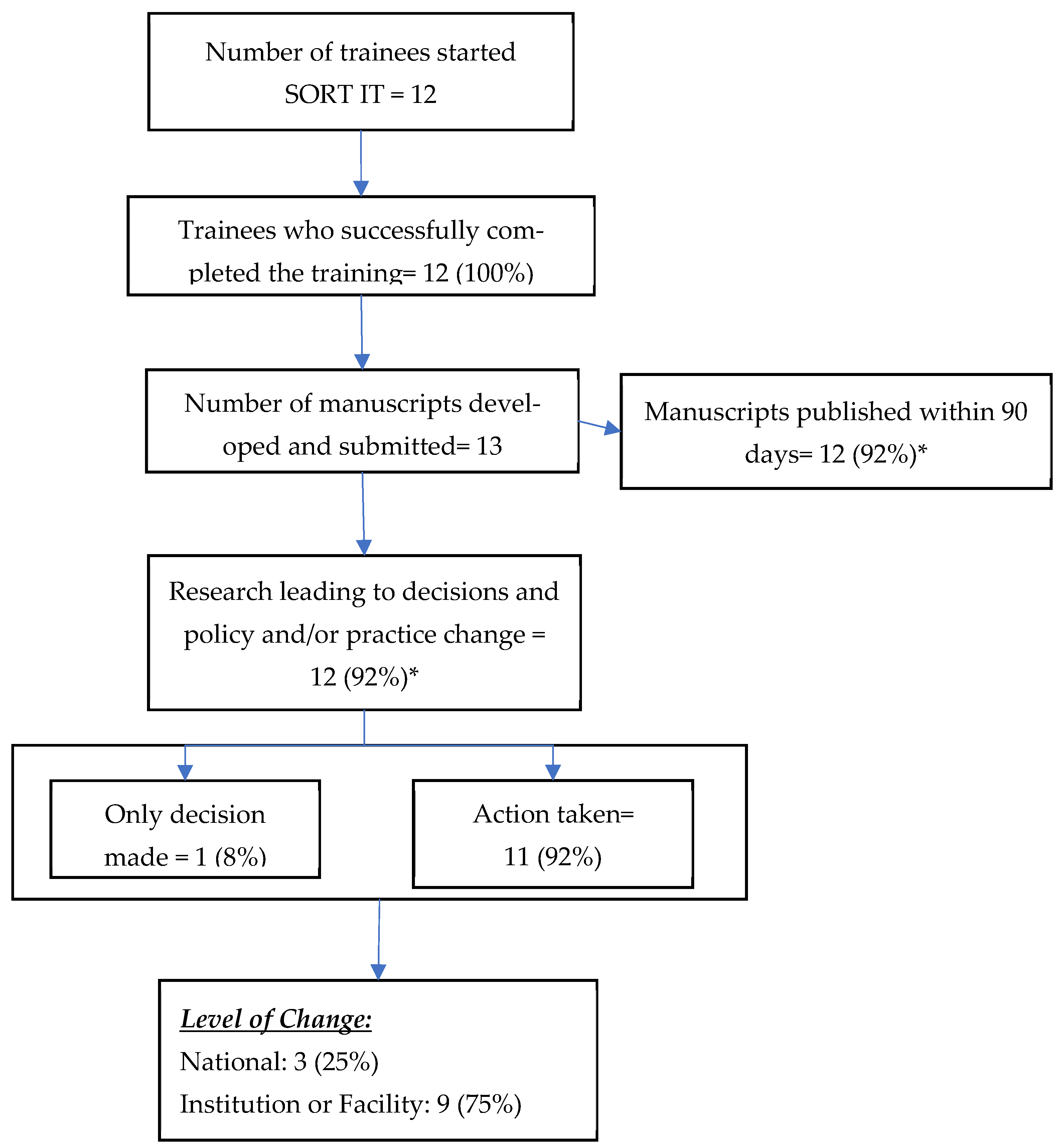 - Kumar, A.M.V.; Shewade, H.D.; Tripathy, J.P.; Guillerm, N.; Tayler-Smith, K.; Dar Berger, S.; Bissell, K.; Reid, A.J.; Zachariah, R.; Harries, A.D. Does research through Structured Operational Research and Training (SORT IT) courses impact policy and practice? Public. Health Action 2016, 1, 44–49. [Google Scholar] [CrossRef] [PubMed]