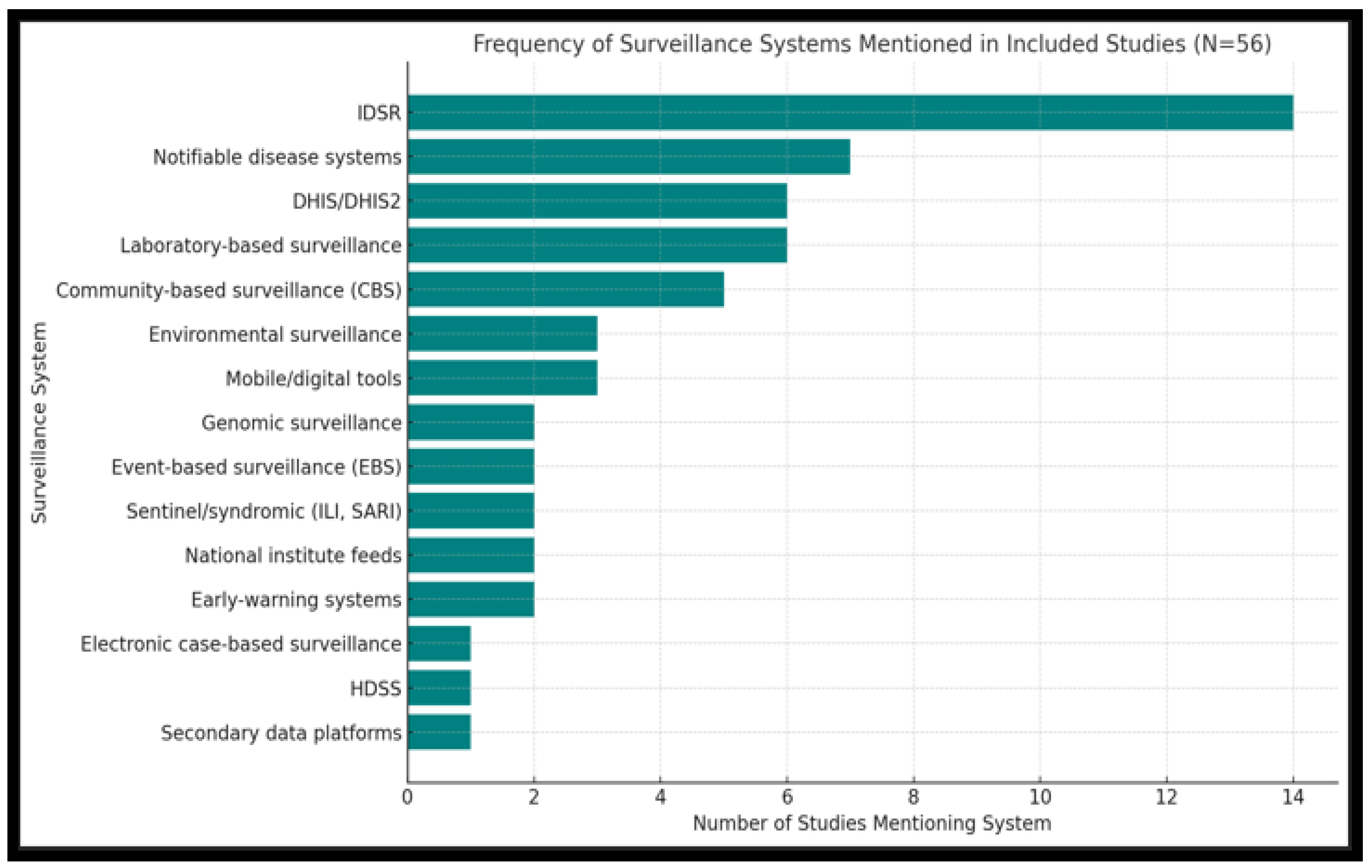 - Strengthen integration between surveillance platforms: National ministries should harmonize vertical programs and IDSR structures to reduce redundancy and ensure comprehensive coverage. Furthermore, develop and adopt national standards for interoperability between surveillance platforms and promote regulatory frameworks aligned with IHR (2005) and Africa CDC protocols [66].