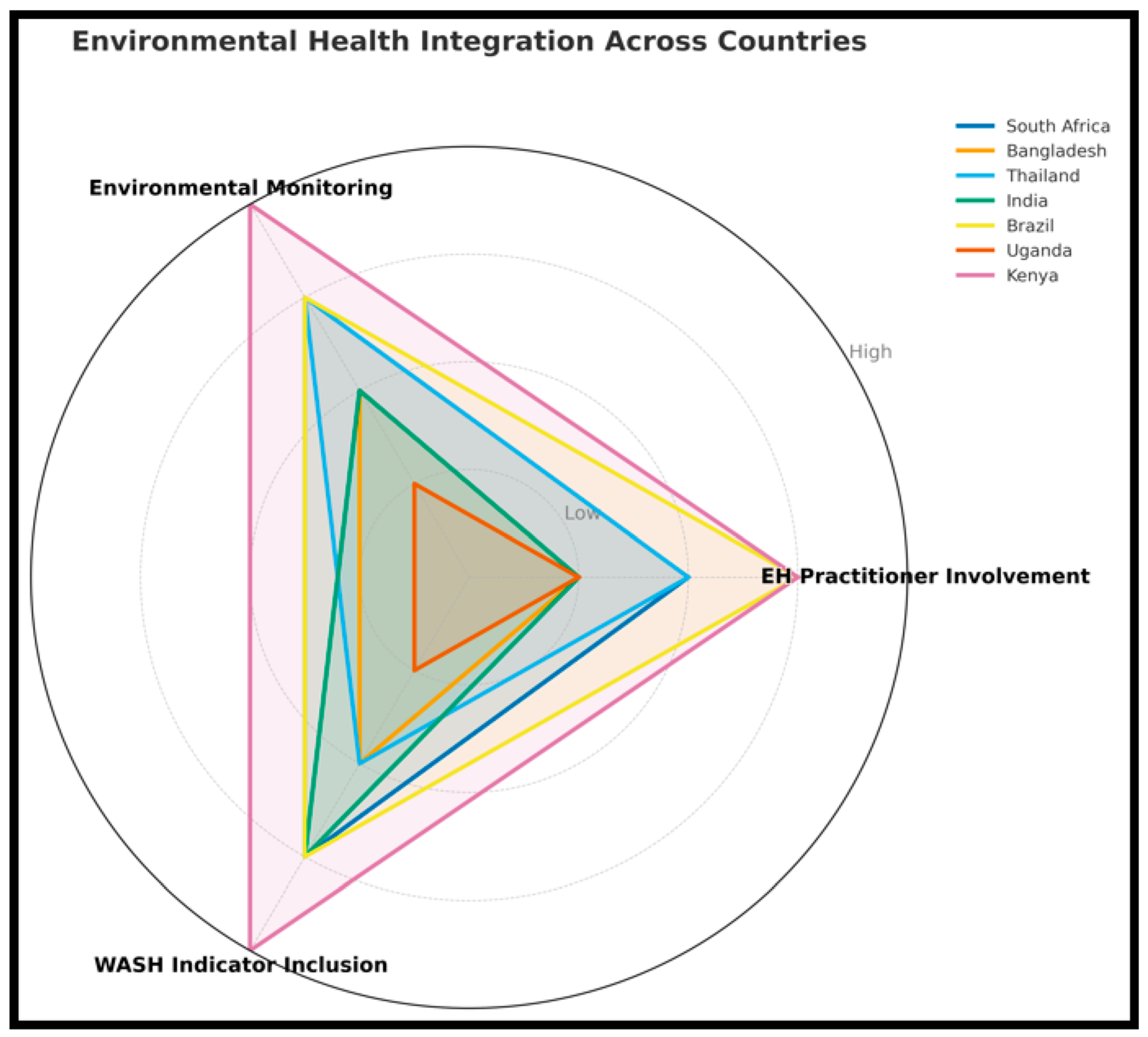 | Uganda | No structured environmental monitoring system | Low | No | EH functions are siloed from national surveillance systems |