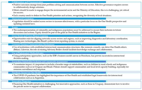 Scheme showing lessons learned from the experiences of focal points on zoonoses, antimicrobial resistance, and food safety in Latin American and the Caribbean countries extracted and categorized through consensus-building among facilitators.