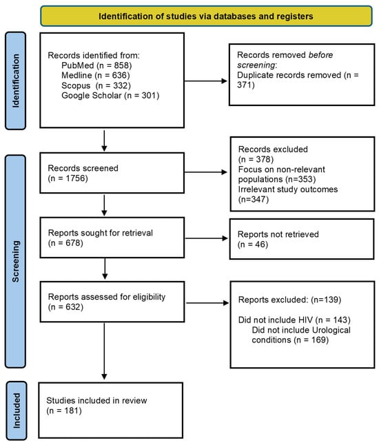 Studies were excluded if they were case reports of singular clinical encounters without broader applicability, non-urological HIV-related topics, paediatric populations, or non-peer-reviewed commentaries or editorials.