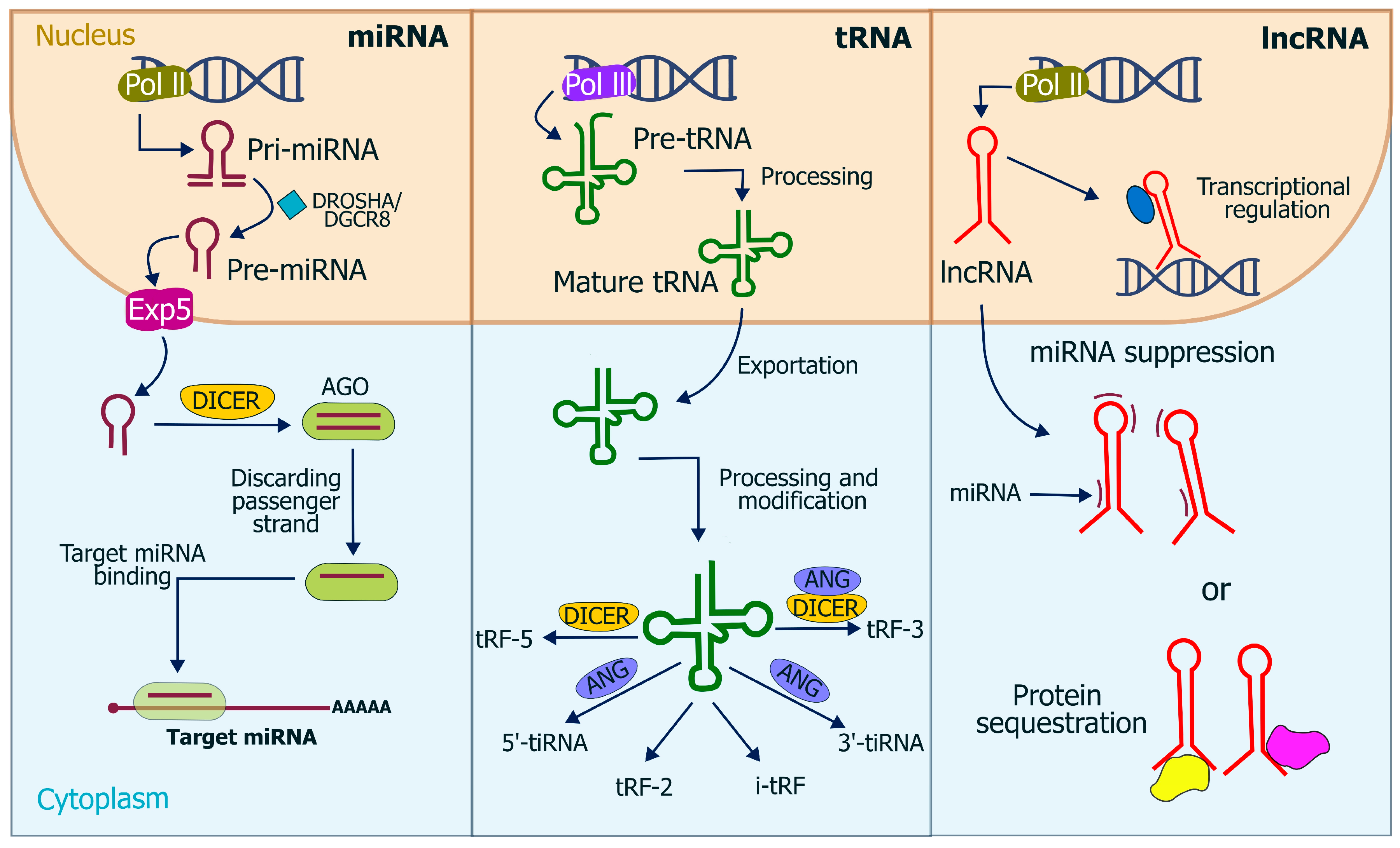 | Precursor | Mature tRNAs cleaved at anticodon loop (tRNA halves) or at D loop, T loop, anticodon loop, or 3′ leader (tRFs) | Mature tRNAs | Primary transcripts from RNA Pol I, II, or III |