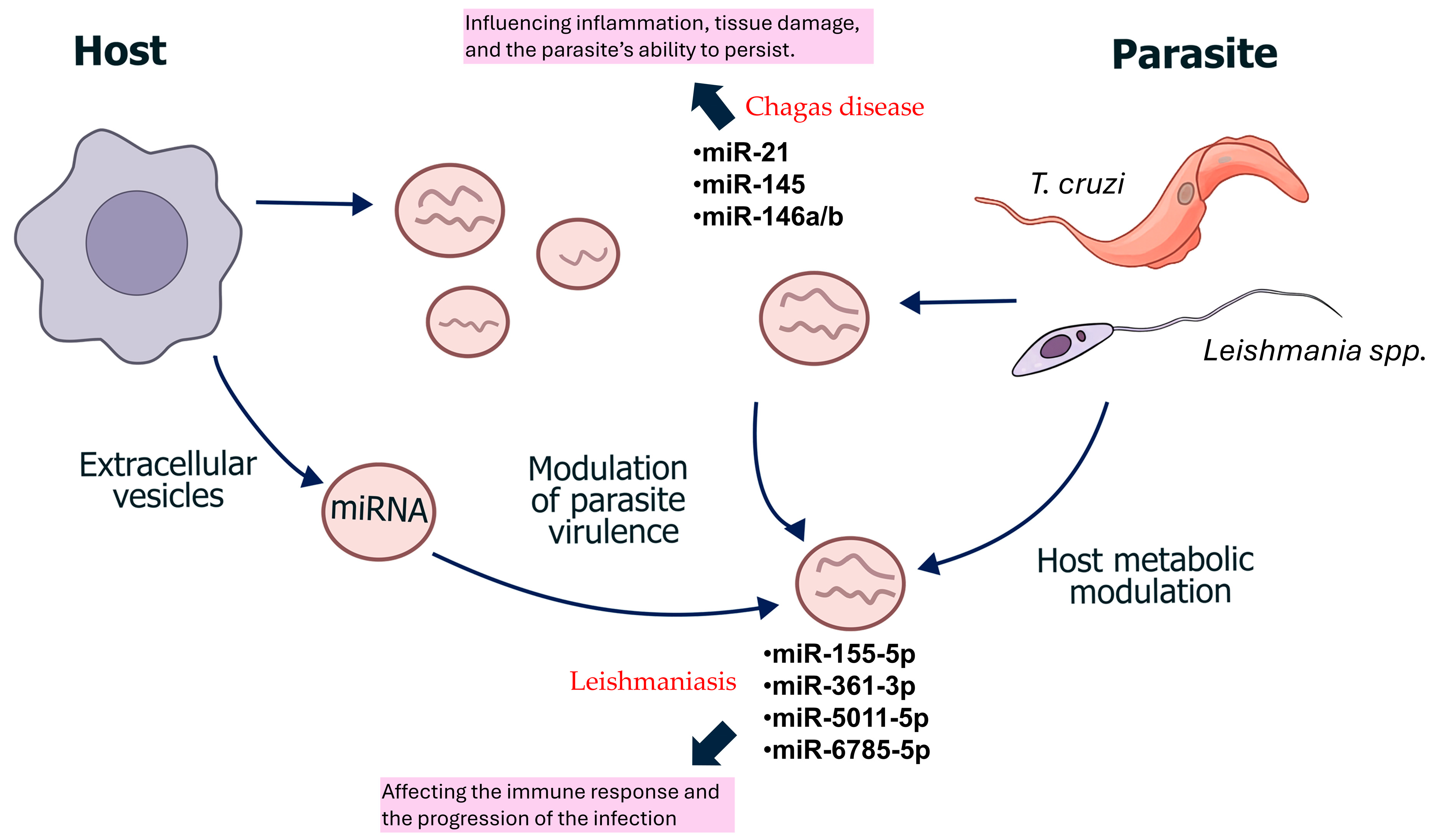 - Rojas-Pirela, M.; Andrade-Alviárez, D.; Medina, L.; Castillo, C.; Liempi, A.; Guerrero-Muñoz, J.; Ortega, Y.; Maya, J.D.; Rojas, V.; Quiñones, W.; et al. MicroRNAs: Master Regulators in Host-Parasitic Protist Interactions. Open Biol. 2022, 12, 210395. [Google Scholar] [CrossRef]