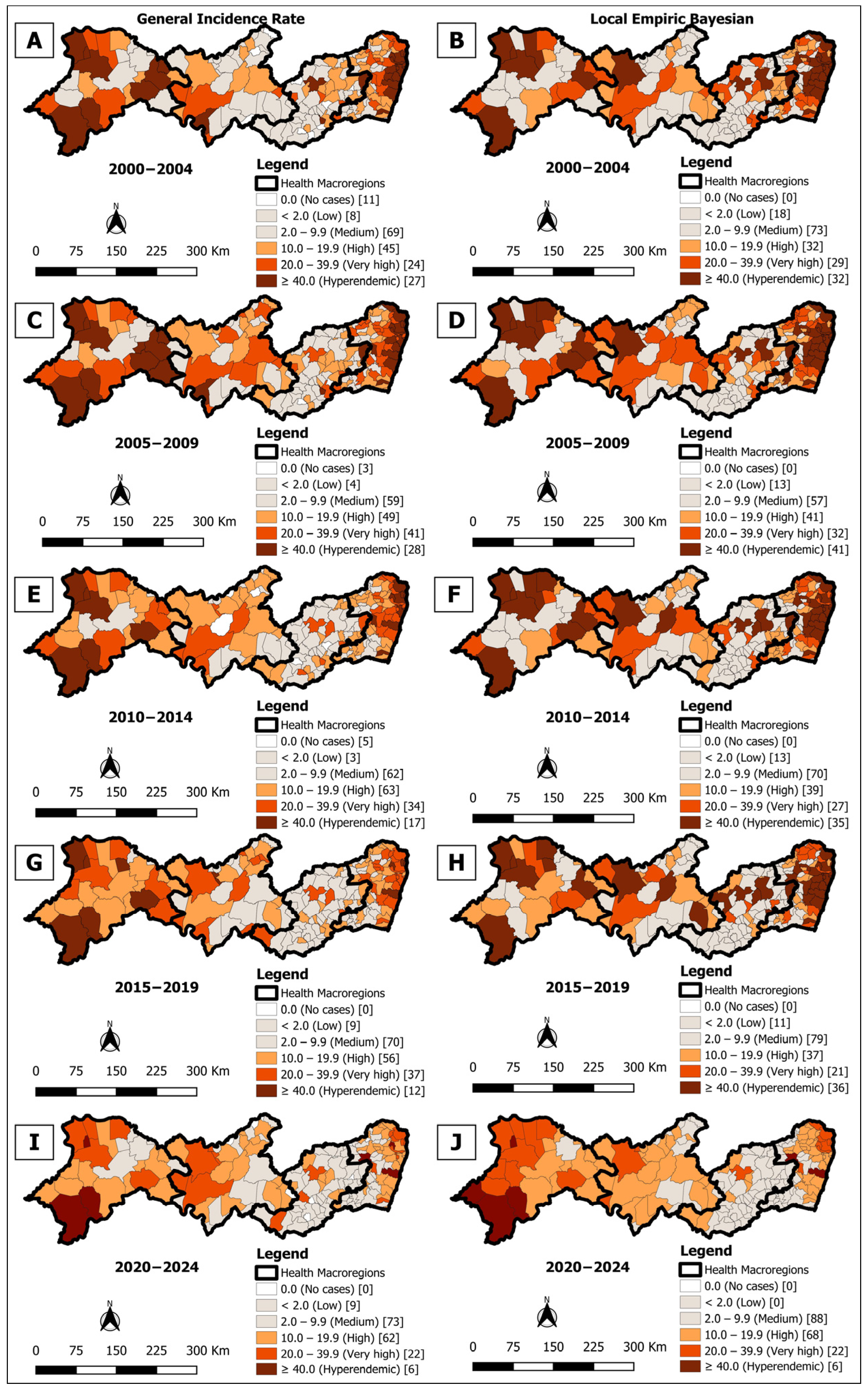 Bayesian smoothing evidenced these areas with greater clarity, revealing 27 (21.2%) municipalities as hyperendemic in 2000–2004 (Figure 4B), 34 (18.5%) in 2005–2009 (Figure 4D), 33 (17.9%) in 2010–2014 (Figure 4F), 14 (7.6%) in 2015–2019 (Figure 4H), and 2 (1.1%) in 2020–2024 (Figure 4J), in addition to an expressive increase in the number of municipalities classified as very high endemicity in the quinquennia 2005–2009 with 57 (31.0%) (Figure 4D) and 2015–2019 with 56 (30.4%) (Figure 4H).