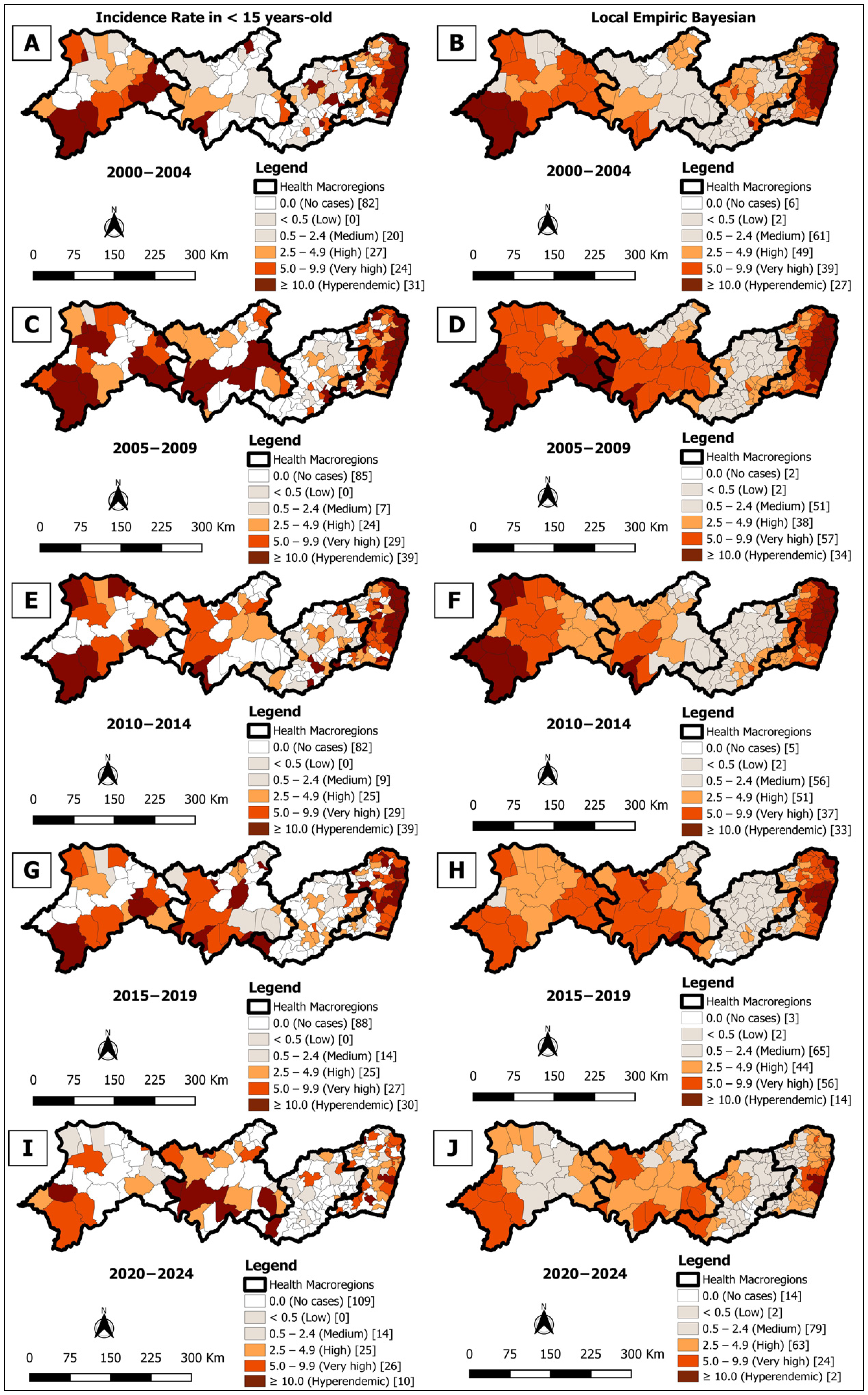 Figure 4. Spatial analysis on the general incidence rate of leprosy in the population aged from zero to 14 years: general incidence rate for individuals under 15 years of age (A,C,E,G,I) and rate smoothed using the local empirical Bayes method (B,D,F,H,J); per 100,000 inhabitants, according to the municipality. Pernambuco, Brazil, by five-year period (2000–2024).