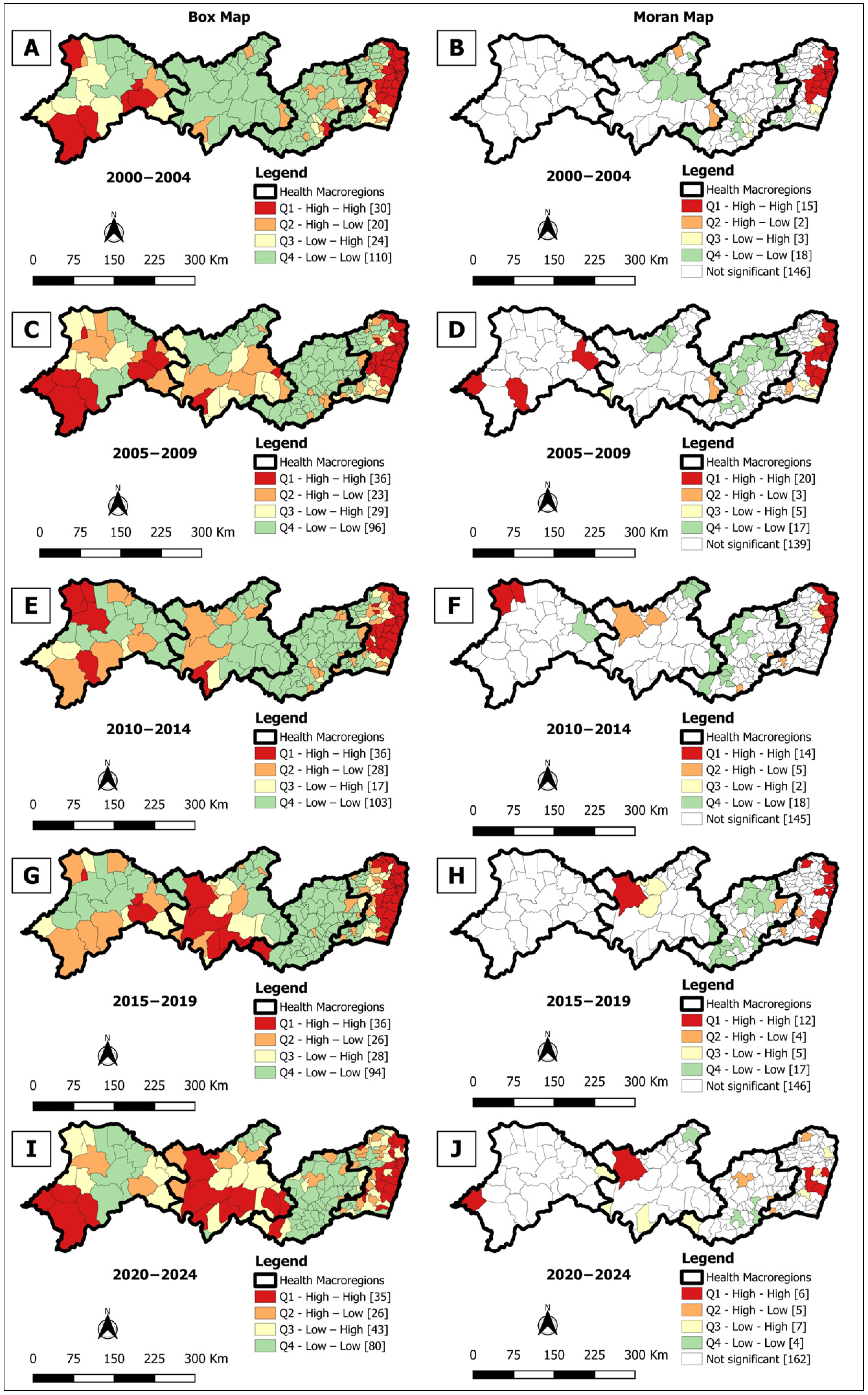The Box Map identified high-risk clusters (High/High) in all analyzed periods, with variations in distribution. There were 4 clusters in the first quinquennium (2000–2004) (Figure 3A), 3 in the second (2005–2009) (Figure 3C), and again 4 in the third (2010–2014) (Figure 3E) and fourth (2015–2019) (Figure 3G). In the last period (2020–2024) (Figure 3I), the number of municipalities in high-risk clusters increased to 47 (25.5%), concentrated mainly in macro-regions I, III, and IV, indicating greater territorial dispersion of the disease.