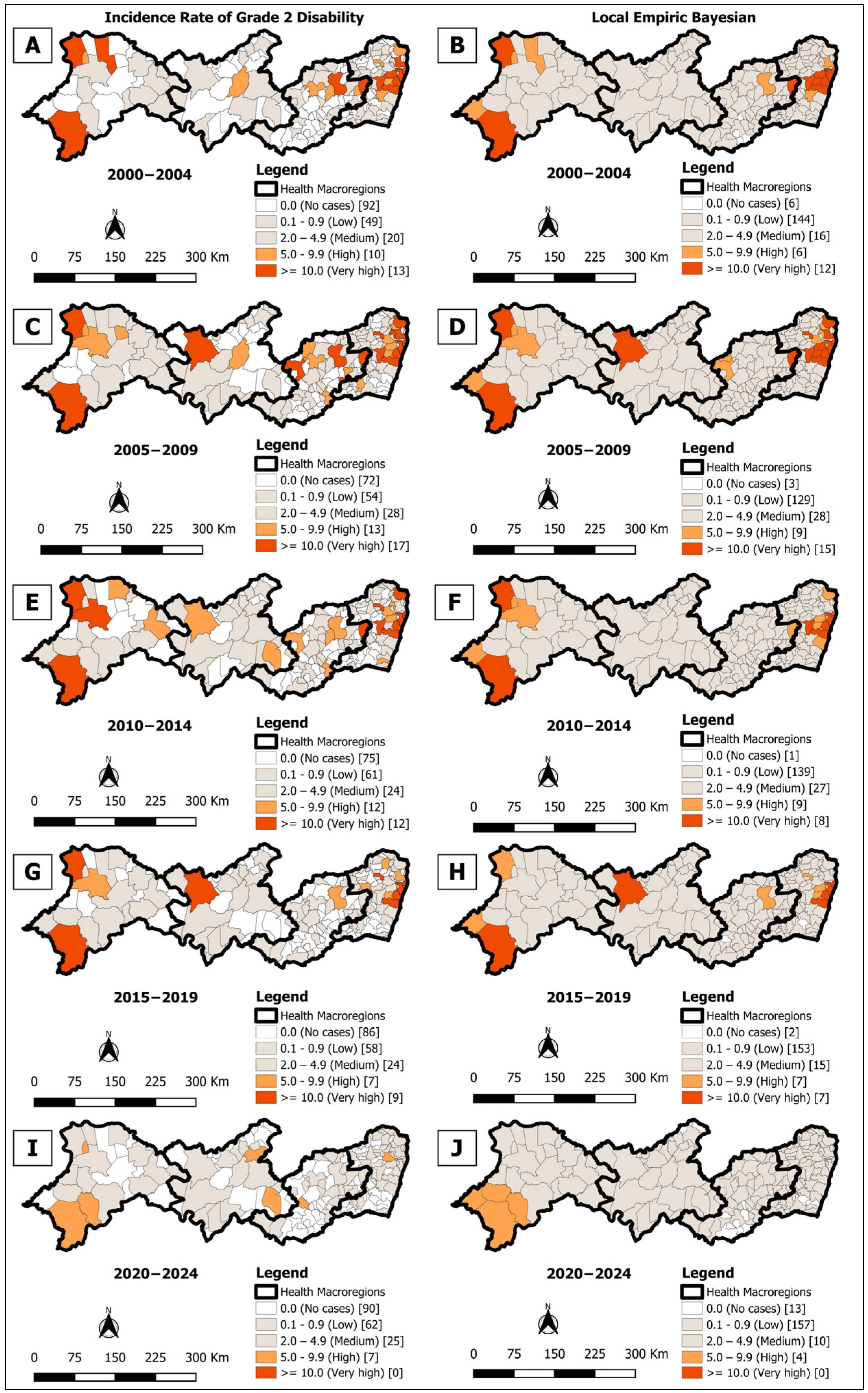 Figure 6. Spatial analysis on the rate of incidence of leprosy with a degree of physical disability at the time of diagnosis for incidence rate for cases with grade 2 disability (A,C,E,G,I) and rate smoothed using the local empirical Bayes method (B,D,F,H,J), per 100,000 inhabitants, according to the municipality. Pernambuco, Brazil, over five-year period (2000–2024).