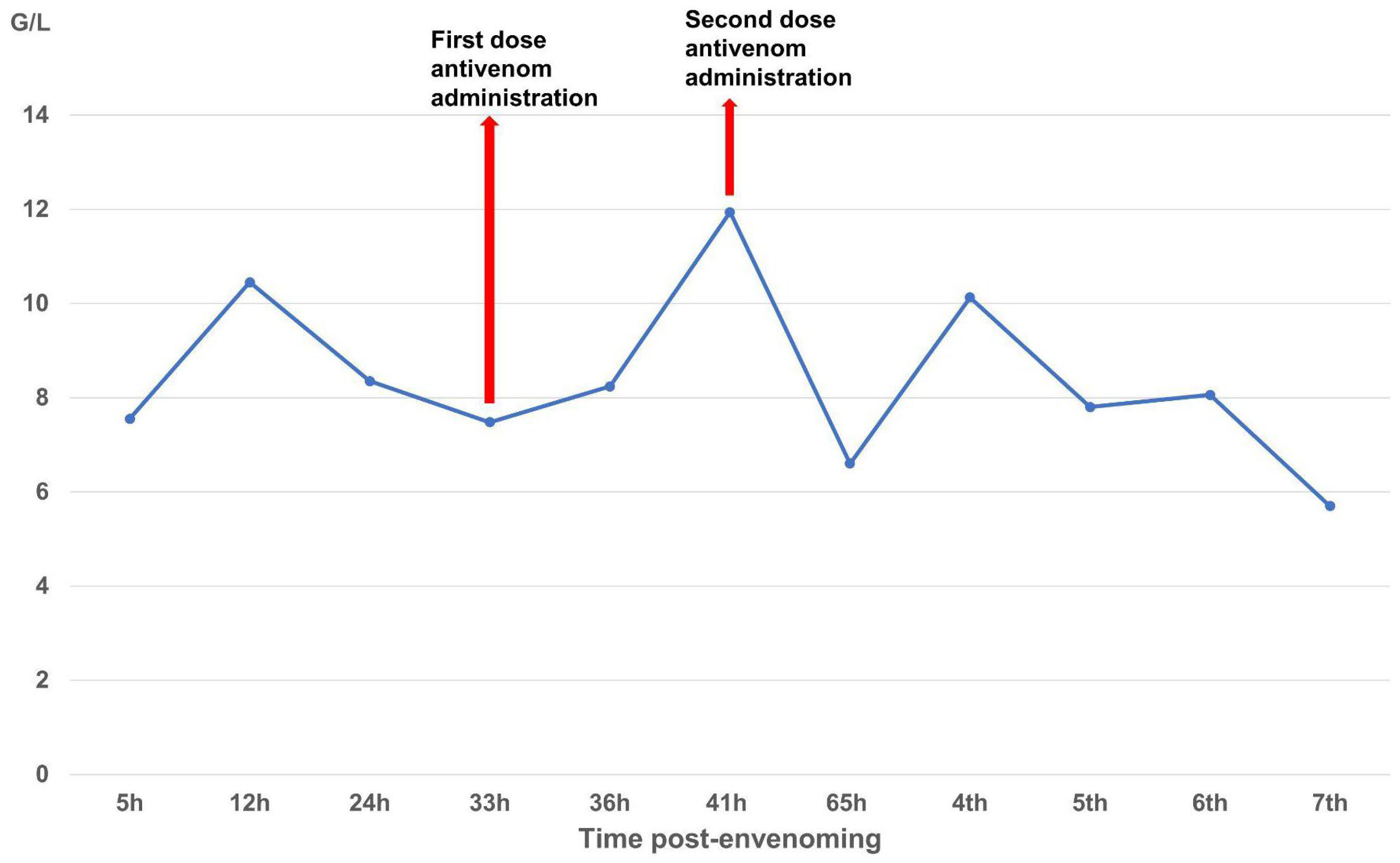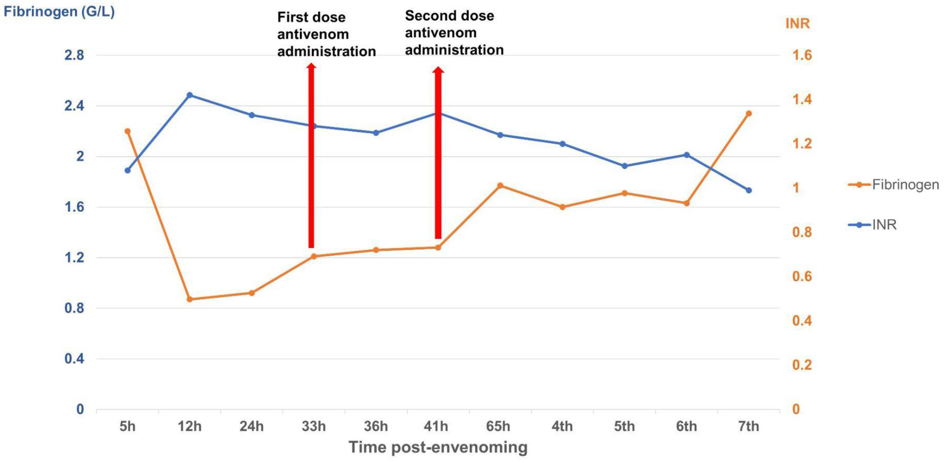 The case described here met conditions for antivenom administration due to local necrosis and coagulopathy immediately evident in paraclinical results. However, antivenoms were unavailable locally and required transport from Ho Chi Minh City to Hanoi, resulting in major delays with the first dosage being administered 33 h and the second dosage 39 h post-bite. Antivenom should be administered as soon as possible following a snakebite, ideally within 4 h as per manufacturer guidelines, though it can still be effective for as long as 24 h post-bite. Considering the delayed administration of antivenom in our case, we observed rapid improvement in the patient’s symptoms and laboratory results. Three important parameters for evaluating the impact of snake envenomation and antivenom on the immune system include WBC (normal range 4–10 G/L) for inflammation, INR (normal range 0.8–1.2), and fibrinogen (normal range 2–4 G/L) for coagulation. After the envenomation, the venom caused tissue damage and triggered an inflammatory response, resulting in WBC increasing to 10.45 G/L by day 2 post-bite. The venom also caused clotting disorders and bleeding, evidenced by the depletion of the clotting factor fibrinogen to 0.87 G/L and extending the coagulation INR to 1.42. These parameters tended to increase slightly for fibrinogen and decrease for INR and WBC to normal levels as the patient was treated with supportive medicines, including analgesics and antibiotics. Following antivenom administrations, these parameters gradually improved to normal levels in the subsequent days of treatment. Interestingly, WBC initially increased above normal to 11.94 G/L after antivenom administrations, most likely due to an immune response to the antivenom acting as an antigen; however, these levels rapidly normalized (<10 G/L), indicating no adverse reactions. Our clinical results demonstrate that the timing of antivenom administration is crucial for effectively reducing venom toxicity, but support the use of antivenom even when administration is delayed.