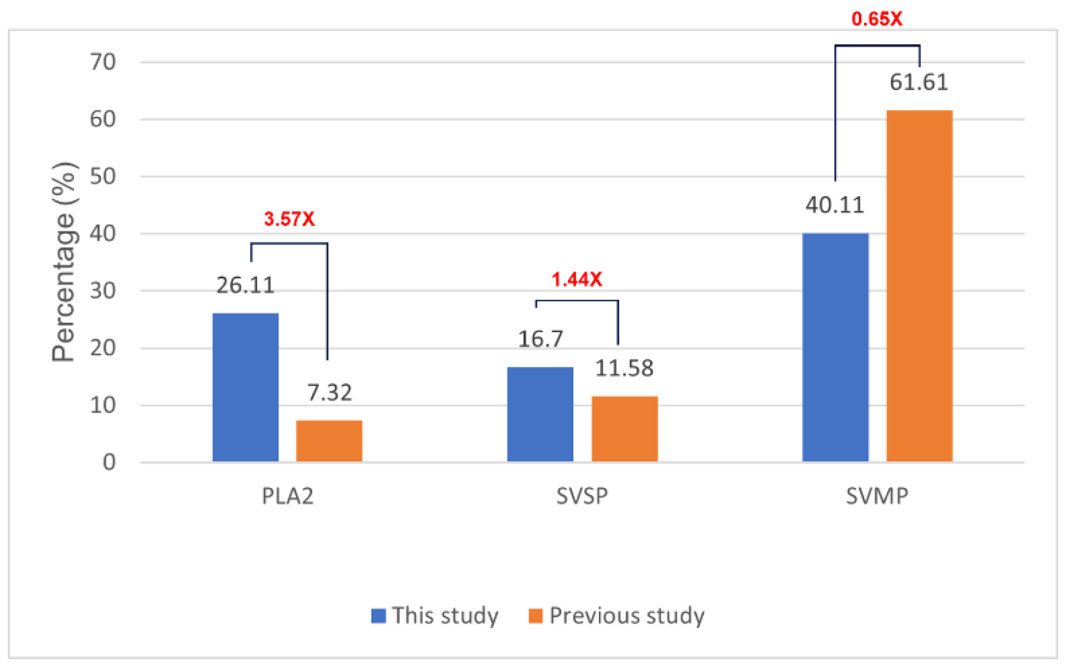 2 hydrolyzes the phospholipids in red blood cell membranes, resulting in hemorrhage and swelling. The severity of the effects induced by these toxic components is associated with their respective relative abundances in snake venoms. We found significant differences in proportions of toxin components of SV6 venom when compared to the previous reports of
