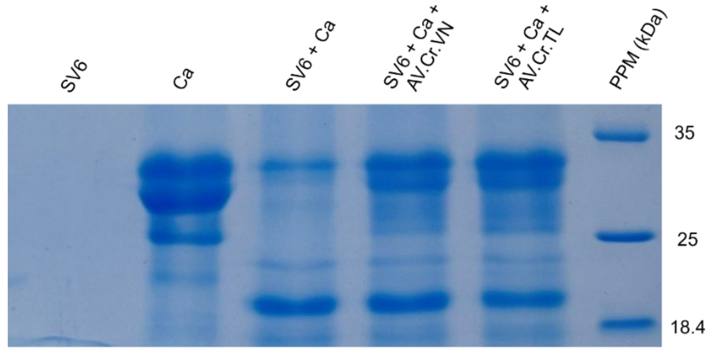 To produce a molecular fingerprint of the protein components in the C. rhodostoma venom, crude SV6 venom (174.38 mg/mL) was diluted with 1X phosphate-buffered saline (PBS), pH 7.4, to a working concentration of 10 mg/mL. A 10 µg aliquot of this 10 mg/mL solution was then subjected to gel electrophoresis. We used a casein substrate to assess the proteolytic activity of snake venom proteinases, and a 1% casein solution (0.01 g/mL) prepared in phosphate-buffered saline (PBS) pH 7.4 was used as a negative control. The SV6 sample was adjusted to the same amount (0.16 µg, 0.08 µg/µL) and incubated with 1% casein (0.01 g/mL) for 10 min at 37 °C, after which the percentage activity was measured. To evaluate the inhibitory capacity of the C. rhodostoma antivenoms produced in Vietnam (AV. Cr. VN) and Thailand (AV. Cr. TL) against our venom sample, the SV6 sample was adjusted to the same amount (0.16 µg, 0.08 µg/µL) and incubated with each antivenom (0.16 µg, 226.2 µg/µL) for 10 min at 37 °C, after which percent activity was measured.