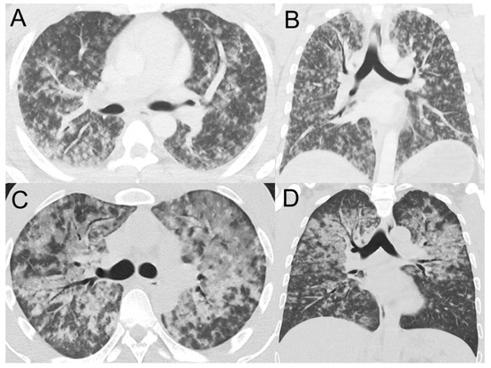 Illustrative computed tomography (CT) findings in individuals admitted to a referral hospital with leptospirosis in Far North Queensland, January 2015–June 2024, who had lung involvement. (Panels A,B): CT chest images ((A): axial and (B): coronal) of an otherwise healthy 30-year-old male who presented with 4 days of generalised malaise, fevers, and haematuria. On presentation he was haemodynamically stable and had no respiratory symptoms; however, within 8 h he deteriorated requiring supplemental oxygen and vasopressor support with noradrenaline. Images shortly after deterioration demonstrate diffuse alveolar opacities, ground glass opacities, and centrilobular nodules. The patient was admitted to ICU where he required intubation and mechanical ventilation. He made a full recovery and was discharged after a 20-day hospitalisation. (Panels C,D): CT chest images ((C): axial and (D): coronal) of an otherwise healthy 37-year-old male who presented with a 3-day history of cough, fevers, and dyspnoea. He was tachypnoeic at presentation but had a clear chest on auscultation, normal oxygen saturation on room air by pulse oximetry and a normal chest X-ray. Within 3 h of presentation the patient developed worsening respiratory distress and an oxygen requirement. At this time, the CT chest revealed extensive ground glass opacities with relative sparing of the lung bases, suggestive of diffuse pulmonary haemorrhage. He required an 8-day ICU admission for vasopressor support with noradrenaline and vasopressin but did not require intubation. He made a full recovery and was discharged from hospital after an 11-day admission.