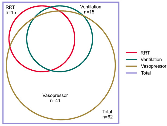 Venn diagram demonstrating the supportive care provided to the patients with laboratory confirmed leptospirosis and lung involvement in a referral hospital in Far North Queensland, January 2015 to June 2024. RRT: renal replacement therapy. There were 10/62 (16%) who received vasopressor support, RRT and mechanical ventilation; 5/62 (8%) who received vasopressor support and mechanical ventilation; 3/62 (5%) who received vasopressor support and RRT; 23/62 (37%) who received only vasopressor support and 2/62 (3%) who received only RRT. There were 19/62 (31%) individuals with lung involvement who did not receive vasopressor support, RRT or mechanical ventilation.
