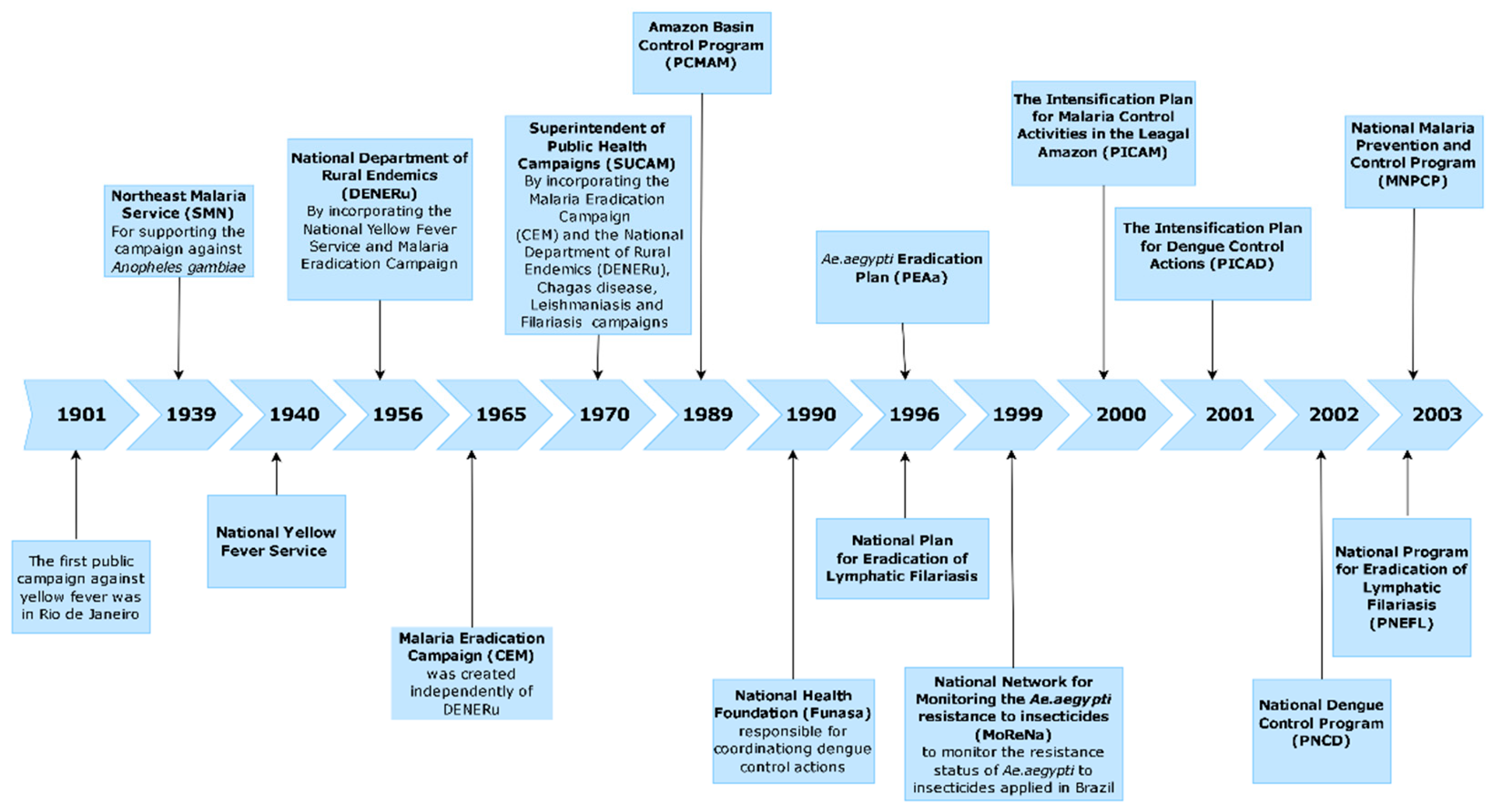Vaccines are unavailable for the majority of these VBDs, except for yellow fever [4] and Japanese encephalitis [5]. Recently, vaccines have become available for dengue, such as Dengvaxia®, TV003/TV005, TAK-003 (QDENGA), and Butantan-DV, and for Chikungunya [6,7]. Vaccines for Zika are still under clinical trials [8,9,10], but face numerous challenges, such as the lack of well-characterized pregnancy models of ZIKV infection, the possibility of cross-reactive antibodies to worsen symptoms of DENV infection, and the difficulty of estimating their efficacy without ongoing transmission in endemic areas [11]. Unfortunately, we have witnessed a growing spread of these diseases to new areas and, at the same time, a significant increase in the number of cases in endemic areas for some of these diseases. This has jeopardized the goals of VBD elimination programs and left authorities responsible for controlling these diseases without good prospects. Additionally, predictive models regarding the impact of global warming on the increase in the incidence of these diseases in future scenarios underscore the seriousness of the situation [12]. Figure 1 shows the timeline of the most important Brazilian national public health programs, targeting VBD.