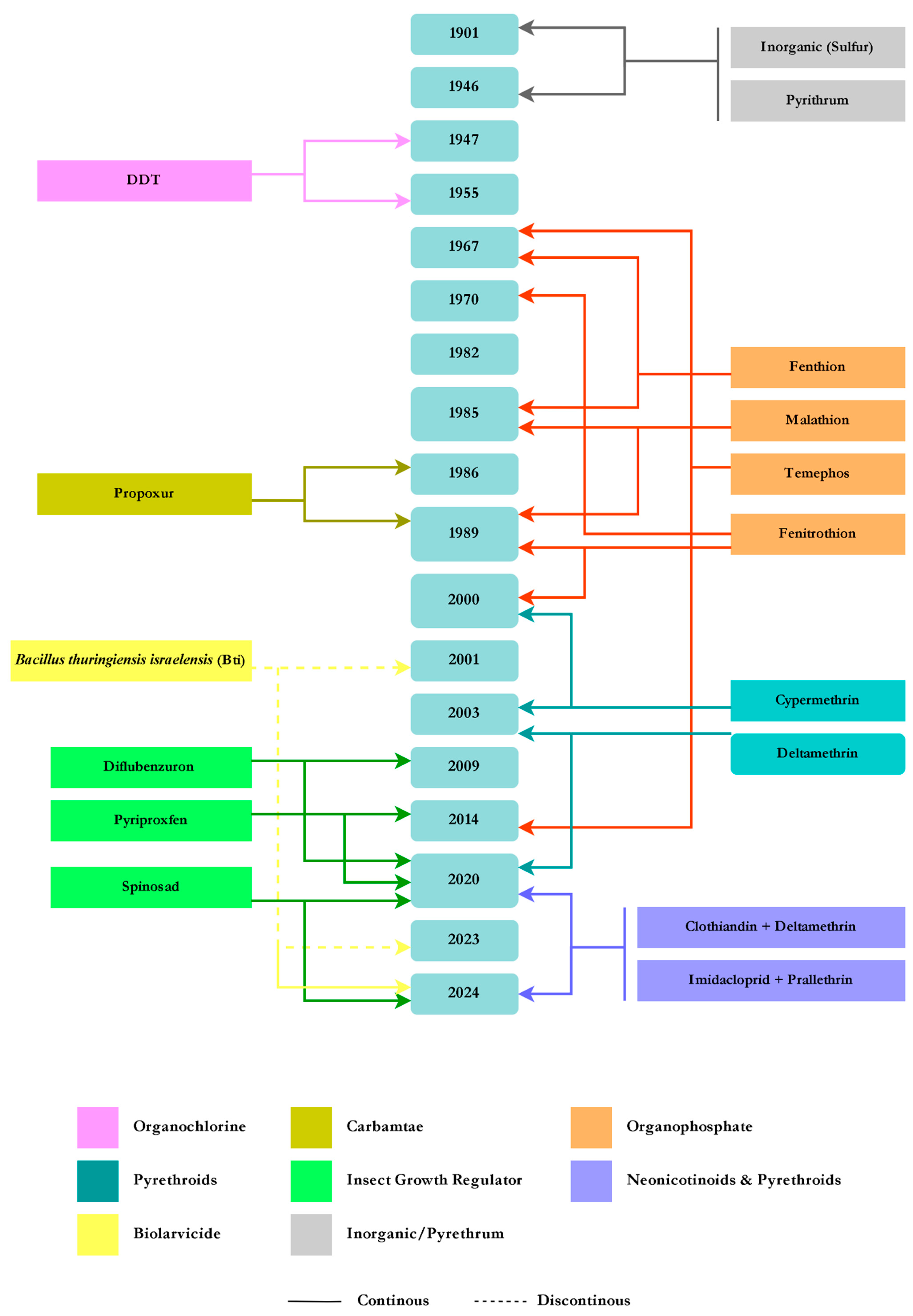Figure 4. Timeline of the insecticides used for the control of Culex quinquefasciatus.