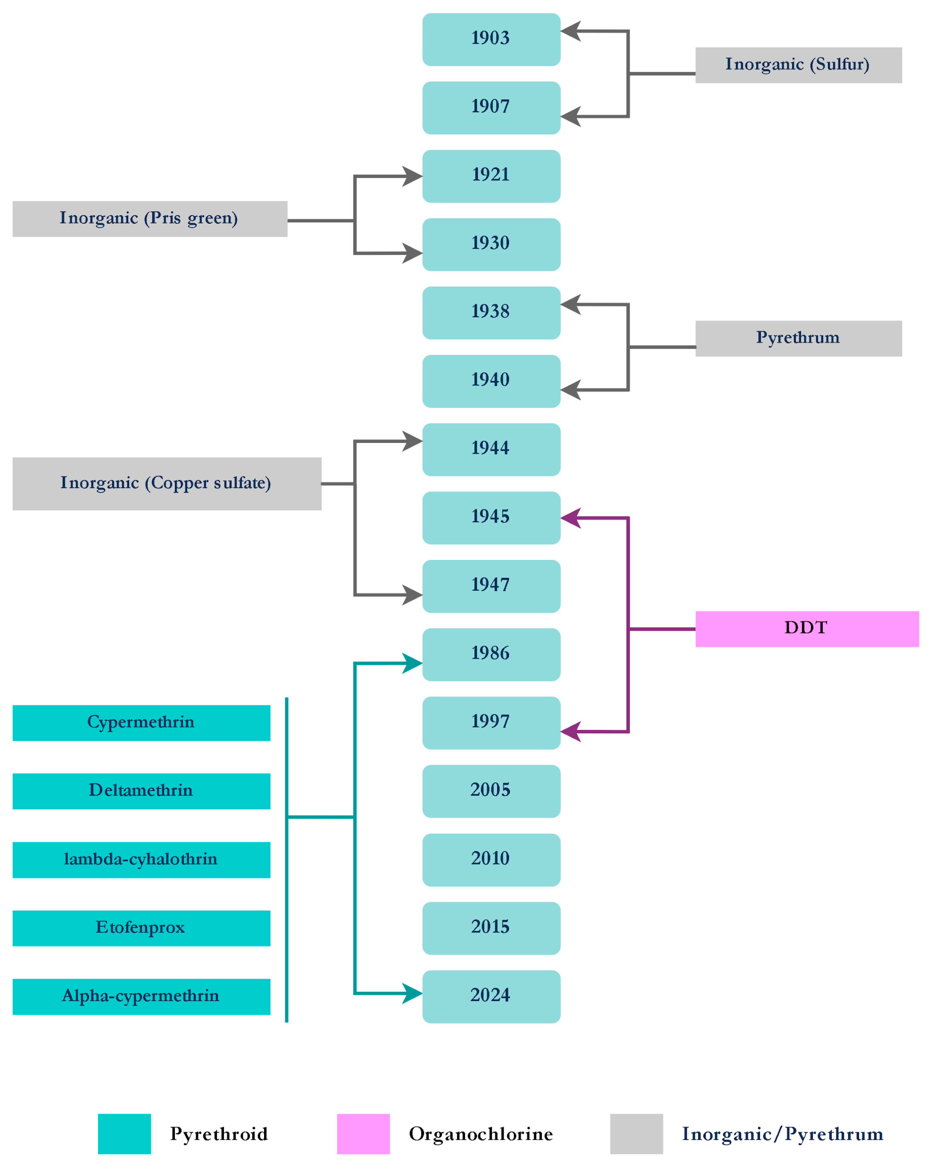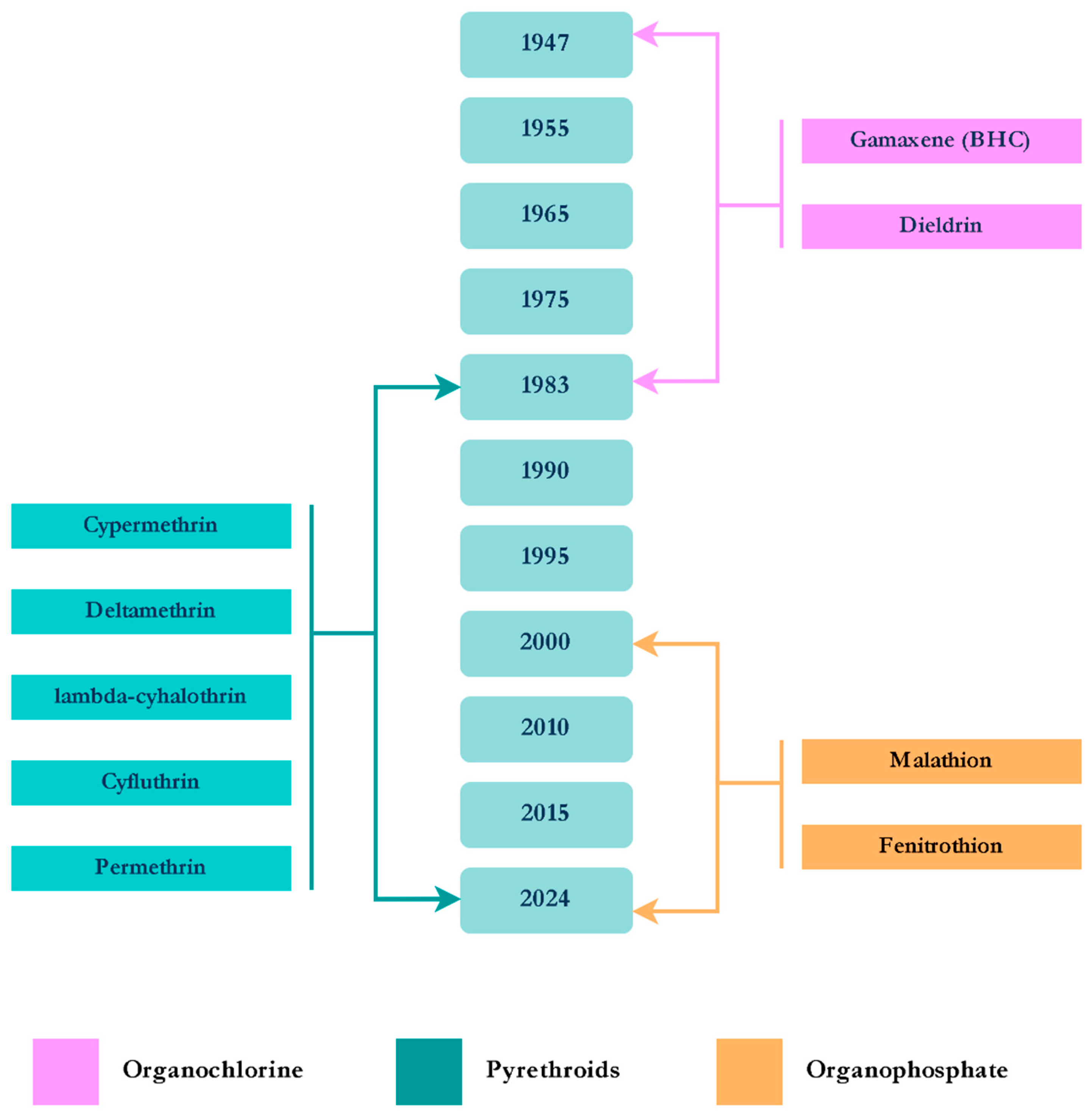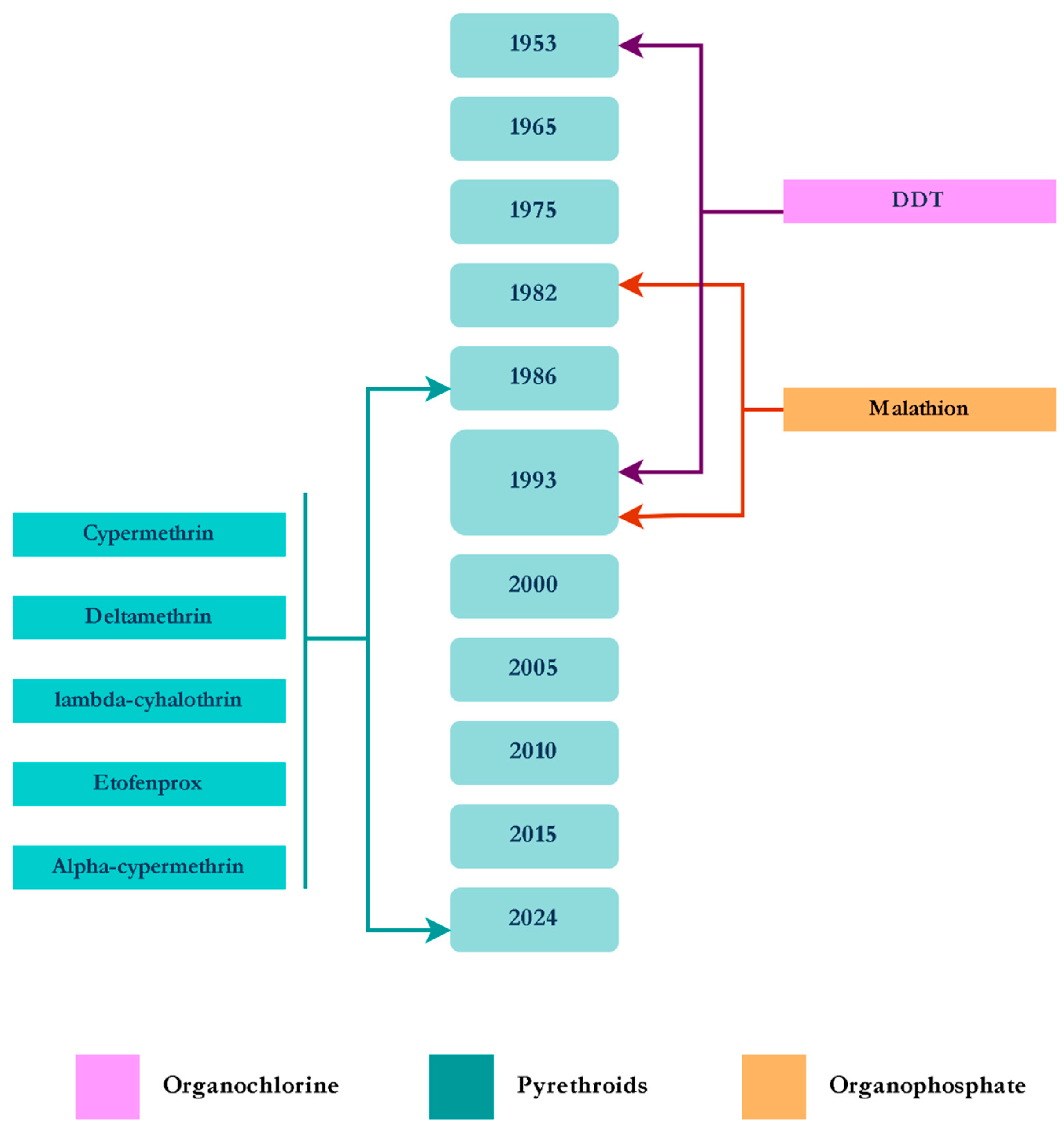 Figure 3. Timeline of the insecticides used for the control of Anopheles spp.