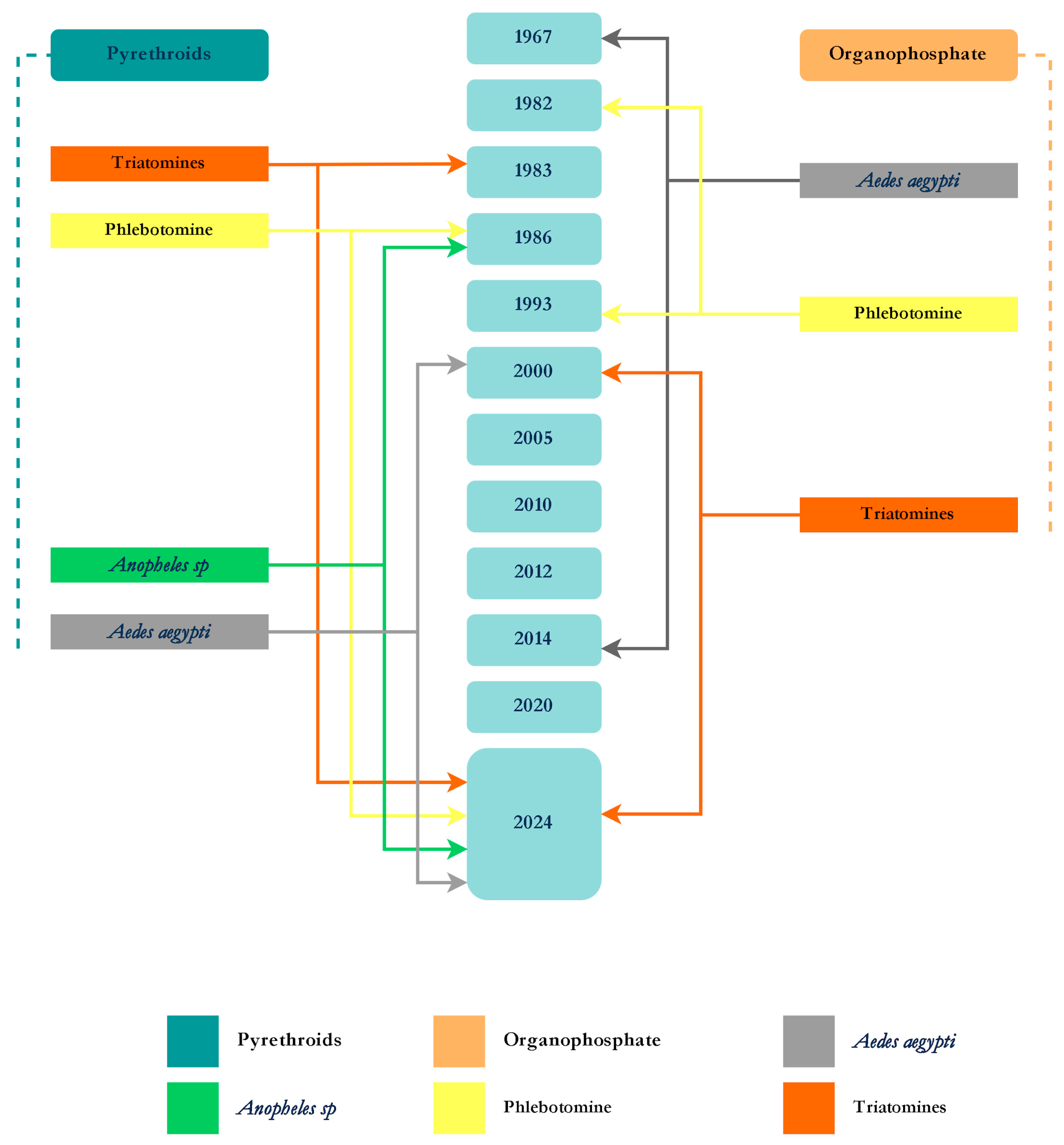 Figure 7. Timeline of the pyrethroids and organophosphates’ overlapping use for control of the four vectors (Ae. aegypti, Anopheles sp., phlebotomine, and triatomine).