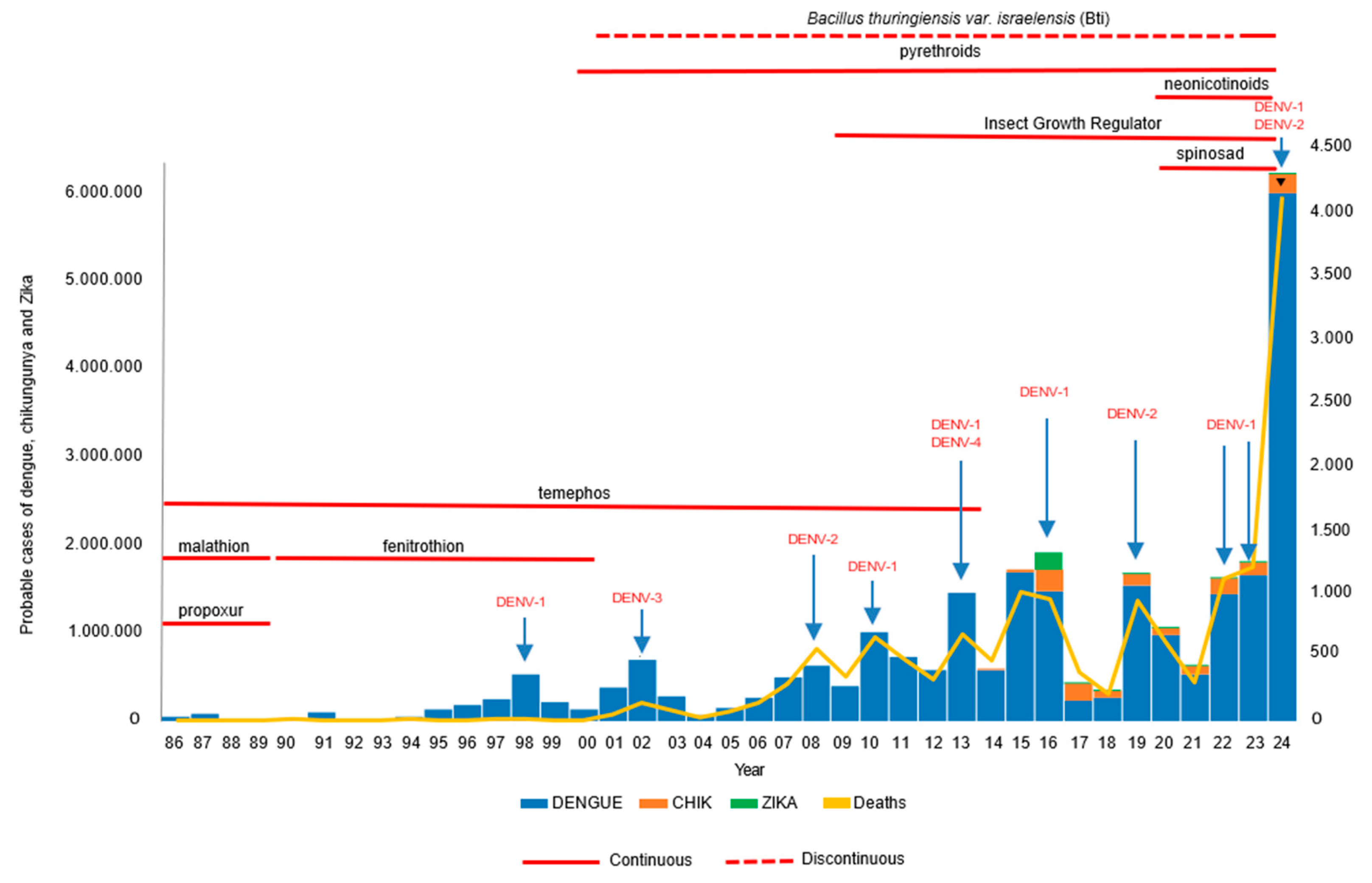 Figure 8. Number of cases of dengue, chikungunya, and Zika over the years, and the use of insecticides for Ae. aegypti control [105].