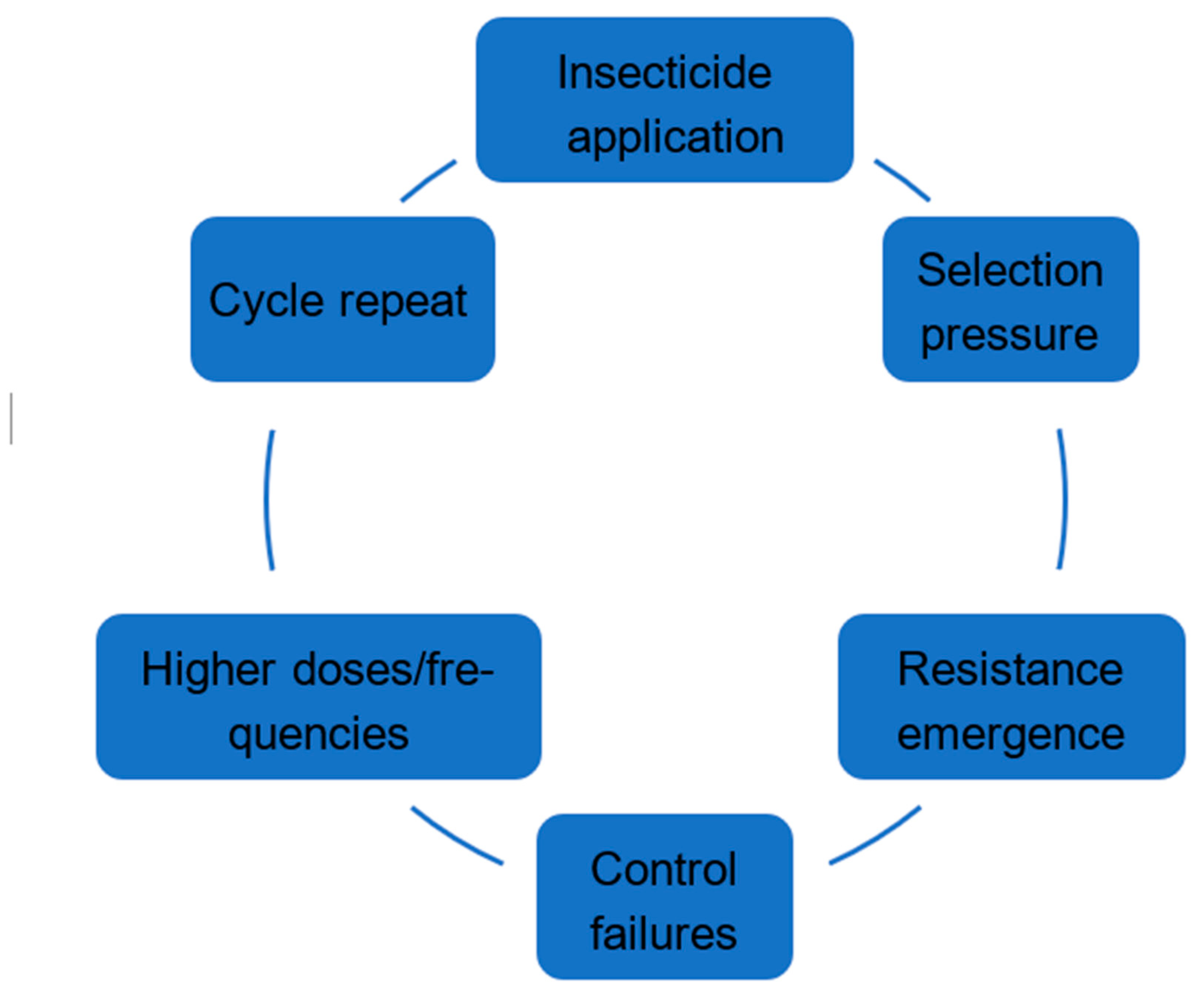 Figure 9. The insecticide resistance treadmill. An escalating cycle of insecticide use and evolving resistance that diminishes long-term control effectiveness.