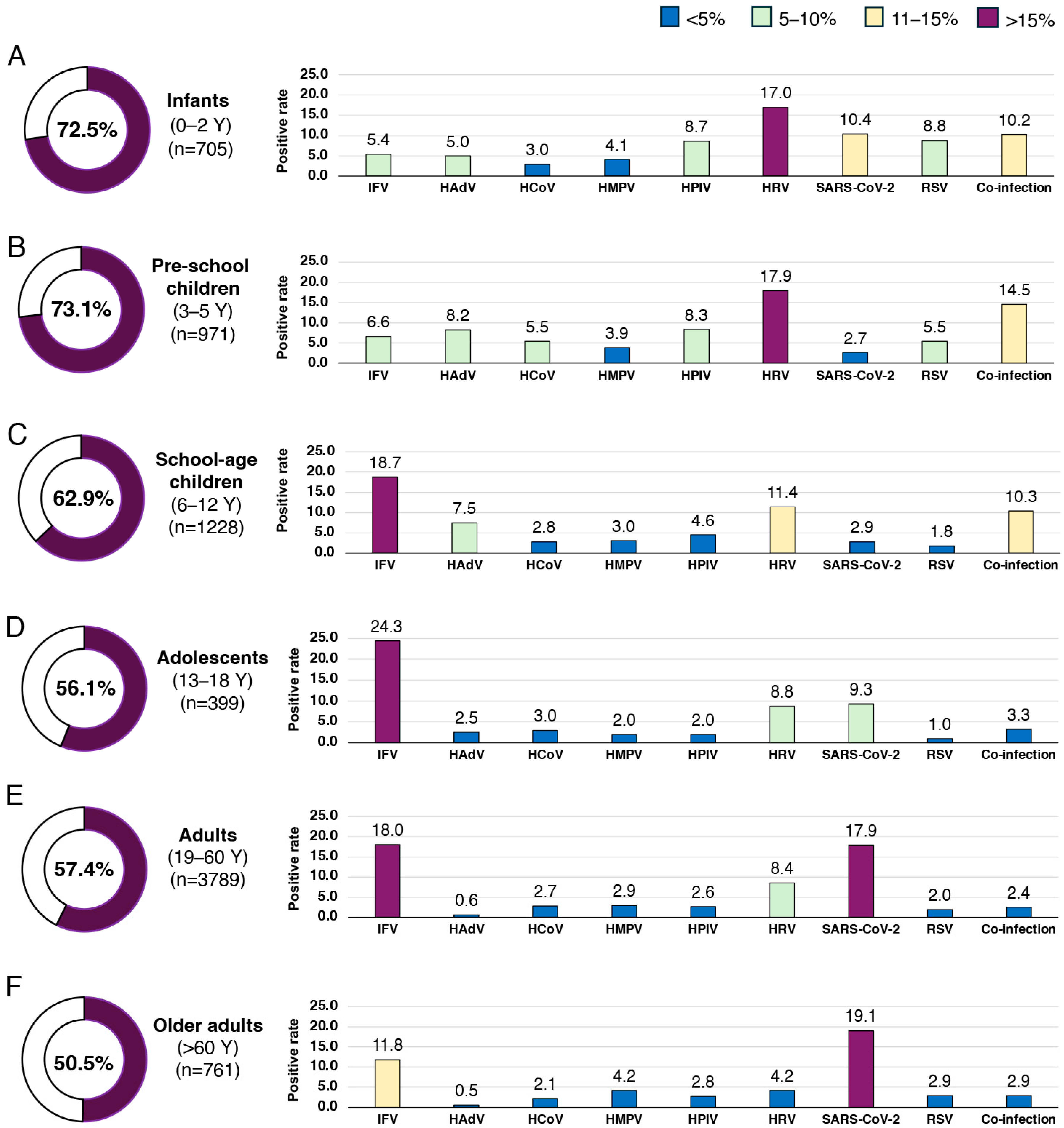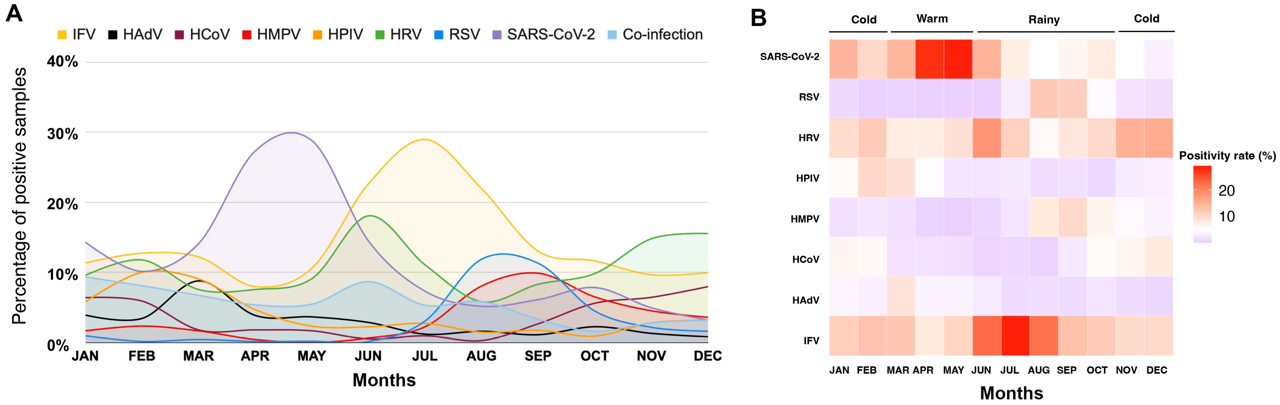 - Zhao, P.; Zhang, Y.; Wang, J.; Li, Y.; Wang, Y.; Gao, Y.; Zhao, M.; Zhao, M.; Tan, H.; Tie, Y.; et al. Epidemiology of respiratory pathogens in patients with acute respiratory infections during the COVID-19 pandemic and after easing of COVID-19 restrictions. Microbiol. Spectr. 2024, 12, e01161-24. [Google Scholar] [CrossRef] [PubMed]
