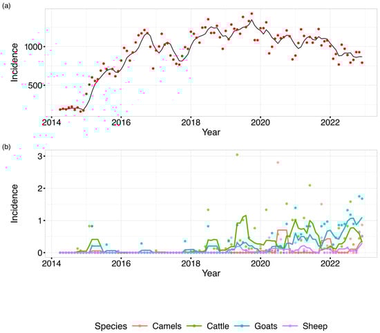A line graph depicting monthly distribution of (a) human and (b) animal brucellosis average incidences in Kenya, 2014–2022. (Applied temporal smoothing using a 4-month-period moving average to reduce noise in the monthly incidence time series and facilitate trend identification).