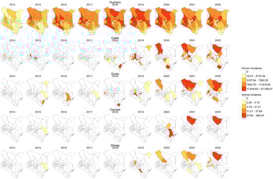 Yearly incidence of human and animal brucellosis at the county level in Kenya, 2014–2022. (For humans, the incidence rate is per 1000 population, while for animal species it is per 1,000,000 population, and the colour is per the percentile. Shapefiles sourced from GADM—https://gadm.org/download_country.html).