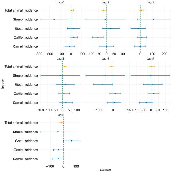 Test of association at national level: As shown in Figure 4 below for individual animal species, at lag 0, sheep incidence was significantly associated with human incidence (estimate = −156.511, p = 0.045), while all other species, including total animal incidence, were not significant. At lag 1, cattle incidence showed a significant negative association with human incidence (estimate = −55.345, p = 0.012), and total animal incidence was also marginally significant (estimate = −17.817, p = 0.090). For subsequent lags (2 to 6), most species-level and total animal incidence variables were not significantly associated with human incidence. However, at lag 4, goat incidence was statistically significant (estimate = −67.529, p = 0.087), and at lag 6, goat incidence became positively and significantly associated with human incidence (estimate = 65.600, p = 0.099). Across all models, the adjusted R2 values remained low (ranging from −0.021 to 0.027), suggesting limited explanatory power. Additionally, model fit metrics such as AIC generally decreased with increasing lag, indicating better model fit at higher lags, although the associations were not consistently significant.