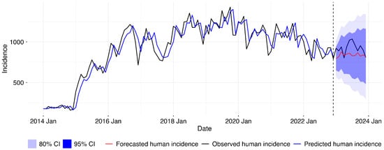 After establishing that the forecasting model without animal incidence fitted our data better than that with the exogenous variable, we retrained the best model with the complete dataset from 2014 to 2022 and then forecasted for 2023, as shown in the Figure 6 below.