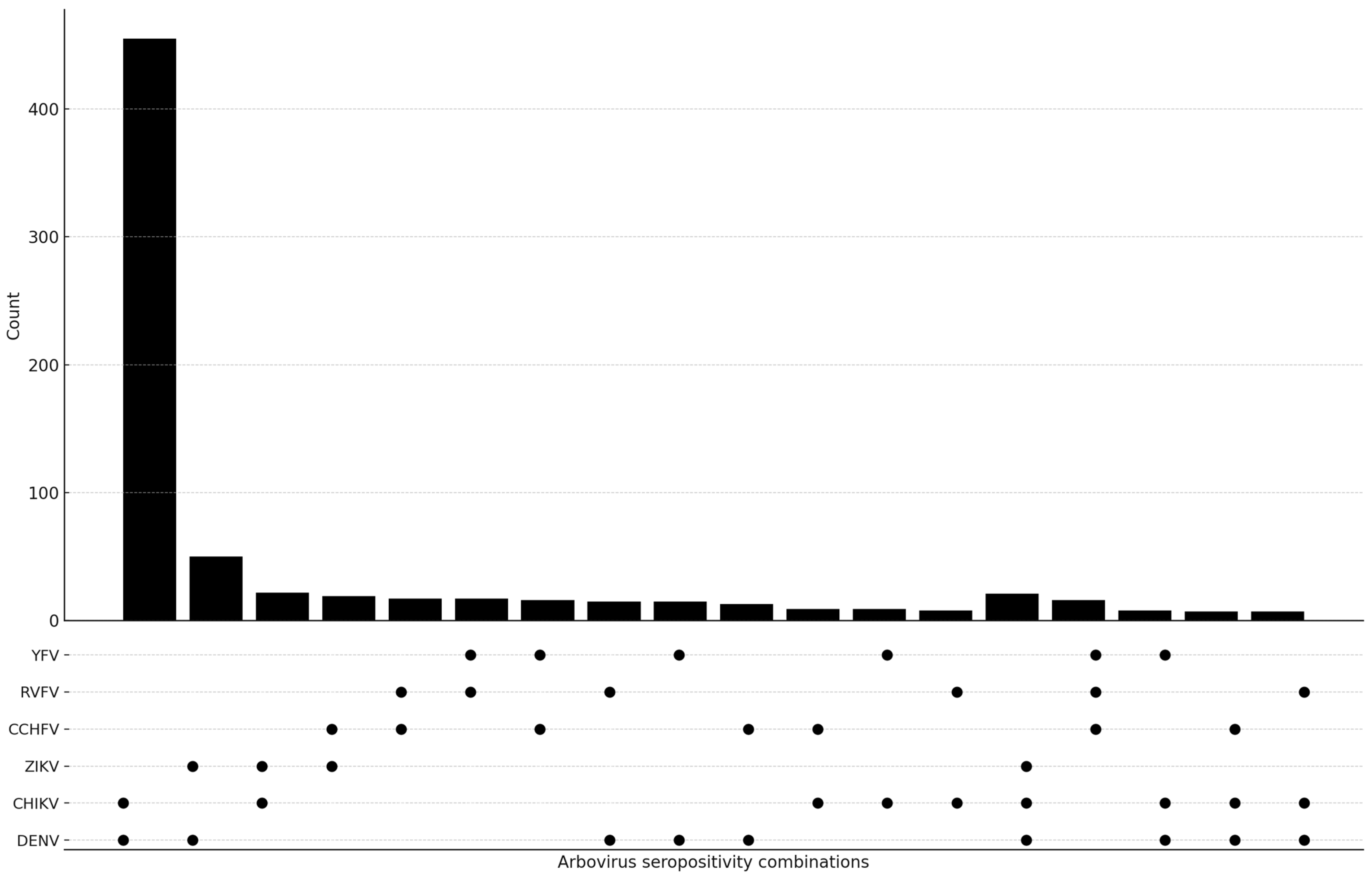 Figure 2. The UpSet plot shows how often dual and triple arbovirus IgG seropositivity patterns appear together, and how much they overlap. The upper bar chart shows the number of participants with each serological combination, while the dot matrix indicates the viruses included in each pattern. The filled circles on the graph show the IgG results. The figure shows how the different viruses (DENV, CHIKV, ZIKV, CCHFV, RVFV and YFV) are exposed to each other.