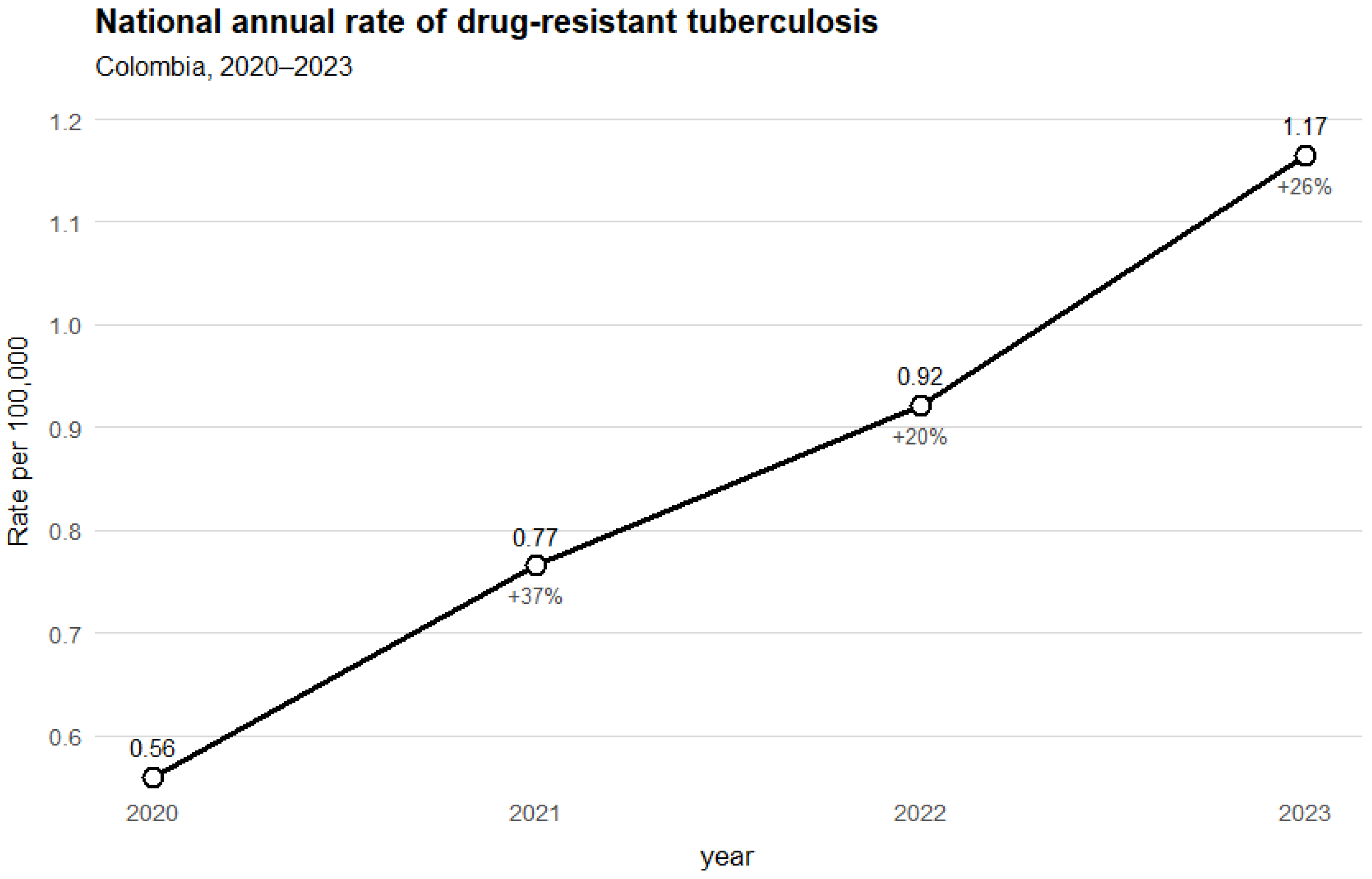In Colombia, the 2022 incidence of DR-TB was 0.67 per 100,000 inhabitants, with a slight increase from the previous year. Although 60% of DR-TB cases were reported as cured, significant challenges persist in clinical management. The COVID-19 pandemic further disrupted TB control, causing delays in diagnosis, interruptions in follow-up, and reduced timely detection, thereby worsening the national DR-TB situation [