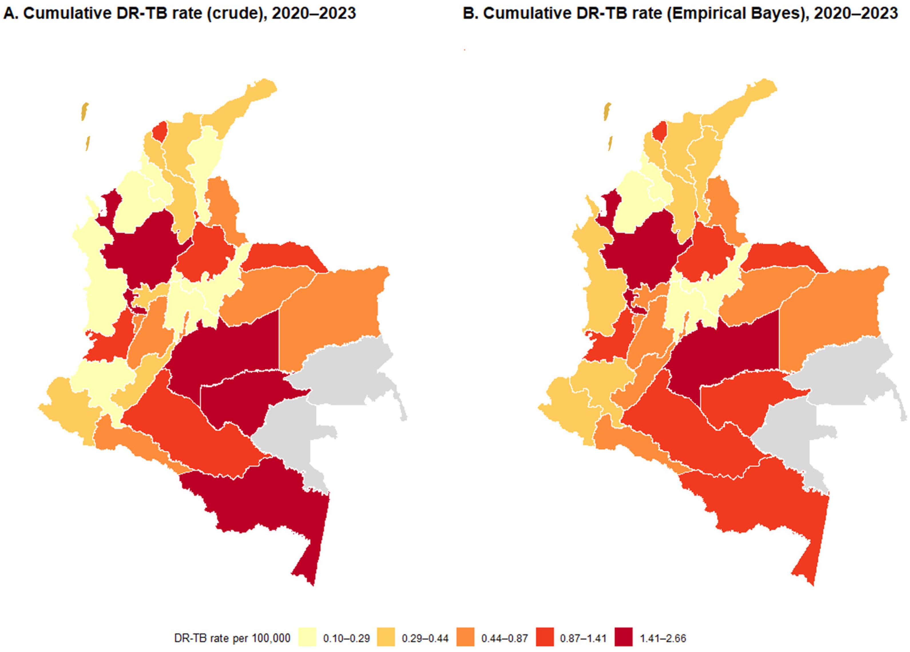Table S1 presents the annual DR-TB rates for all Colombian departments from 2020 to 2023, together with their corresponding 95% confidence intervals. The national annual values increased from 0.56 cases per 100,000 inhabitants in 2020 to 1.17 per 100,000 inhabitants in 2023. Considering the full study period, the cumulative national rate reached 0.86 cases per 100,000 inhabitants.