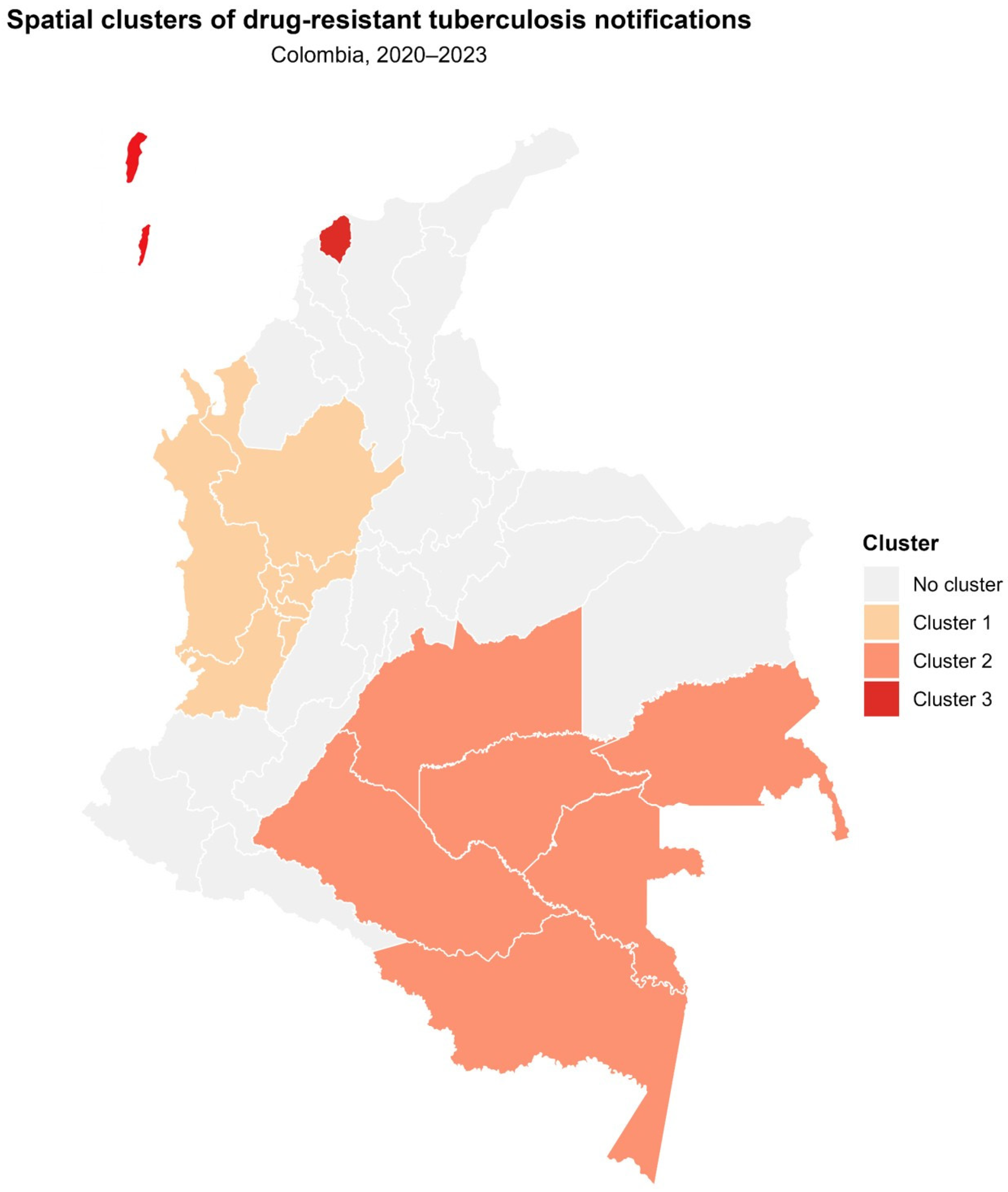 The results of this study highlight clear geographic heterogeneity in DR-TB notifications in Colombia. Three statistically significant clusters were identified through spatial scanning: a central–western group (Antioquia, Caldas, Chocó, Quindío, Risaralda, and Valle del Cauca), a south-eastern cluster spanning the Amazon and Orinoquía regions (Caquetá, Meta, Amazonas, Guaviare, Vaupés, and Guainía), and a Caribbean cluster consisting of Atlántico and San Andrés y Providencia. These areas presented elevated relative risks compared with the national distribution and warrant strengthened and locally adapted public health actions.