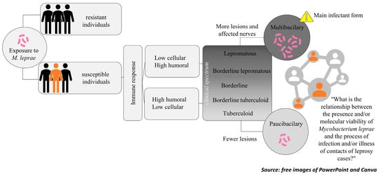 The immunological aspects of the person infected by M. leprae play an important role in the development of leprosy and, in the manifestation of clinical signs [65], are taken into account when classifying the disease [4,66]. The time between infection and diagnosis favors bacterial proliferation and can lead to the development of physical deformities, aggravating the stigma associated with leprosy [67].