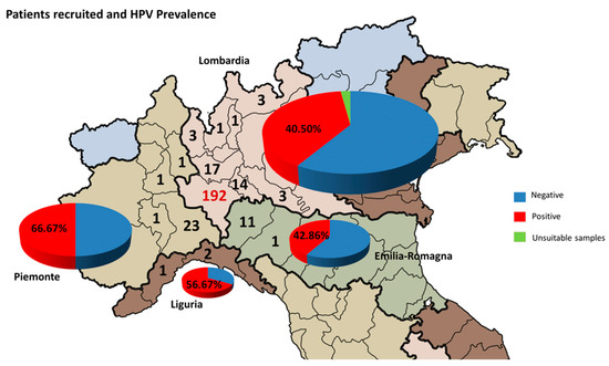 Geographic distribution of patients recruited for semen analysis and HPV test. Numbers in the map represent the patients recruited in each province within the region. The pie charts represent the percentage of positive samples for HPV infection (blue: negative; red: positive; green: unsuitable samples).