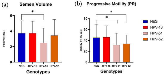 Comparison of parameters of negative and positive samples for the most prevalent HR-HPV. Histograms represent mean ± standard deviation of different parameters in negative samples and in those infected by HPV-16, HPV-51 and HPV-52 for (a) semen volume and (b) progressive motility. * Mann–Whitney test: p-value < 0.05.