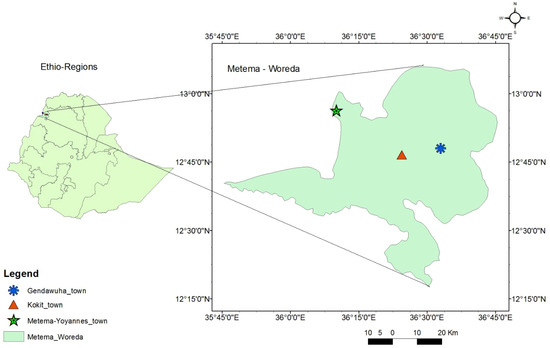 The study was conducted in Metema-Yohannes (12.950649 N, 36.147112 E), Kokit (12.822325 N, 36.326846 E), and Genda-Wuha (12.822333 N, 36.326861 E) towns, Metema district, Ethiopia. The district is 180 km west of Gondar and 925 km northwest of Addis Abeba (Figure 1). The rainy season lasts from June to September, and the average temperature is 25–30 °C. The dry season, October to May, has higher average temperatures (28–42 °C). The district has an average elevation of 734 m above sea level and gets a unimodal rainfall with an annual precipitation of 500–800 mm [33]. There were reports of yellow fever, chikungunya, and dengue cases at the health facilities and along the border with East Sudan [22,34].
