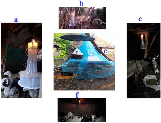 Collection of Aedes species using CDC light trap within a 50 m radius from the target house. (a) sheep, (b) cattle, (c) donkey, (d) outdoor (human), and (e) indoor (human), (f) goat.