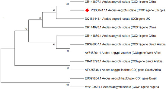 Phylogenetic tree representing the Aedes aegypti COI gene of the Ethiopian sequence is indicated with a red color. The evolutionary history was inferred using the neighbor-joining method [40]. The bootstrap consensus tree inferred from 500 replicates [41] and the percentage of replicate trees in which the associated taxa clustered together in the bootstrap test (500 replicates) are shown next to the branches [41]. The evolutionary distances were computed using Tamura–Kumar method [42]. This analysis involved 11 nucleotide sequences. All positions containing gaps and missing data were eliminated. There was a total of 554 positions in the final dataset. Evolutionary analyses were conducted in MEGA11 [43].